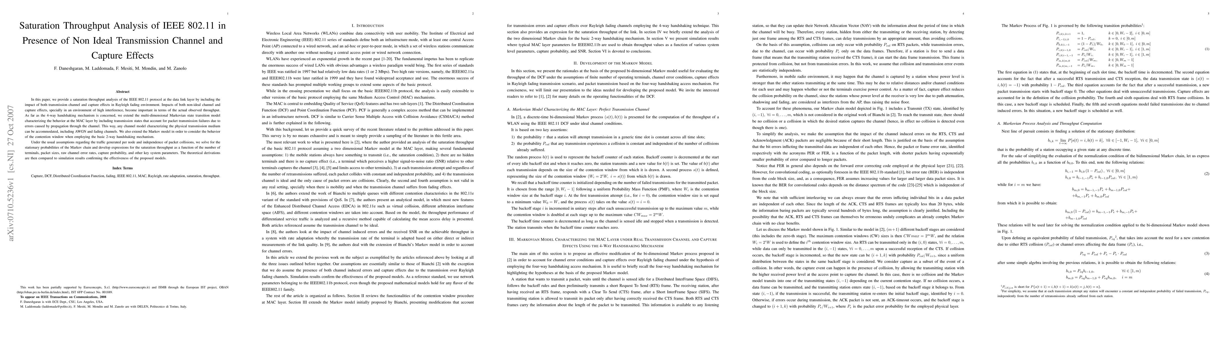 This paper analyzes the IEEE 802.11 protocol's saturation throughput in environments with non-ideal transmission channels and capture effects, providing a more accurate model of packet transmission failures.
