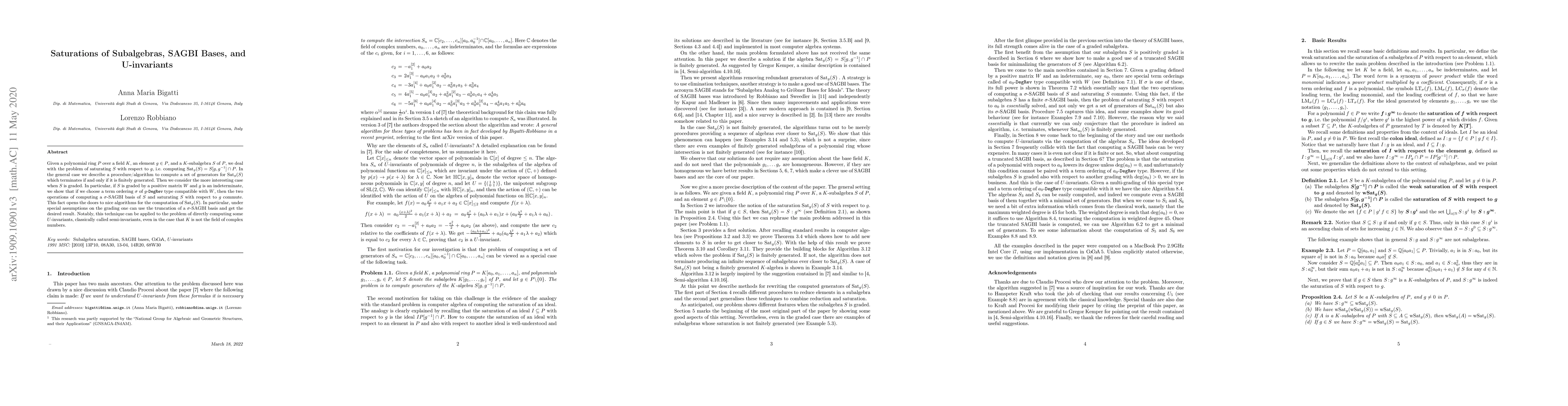This paper investigates the saturation of subalgebras in polynomial rings with respect to elements, presenting an algorithm to compute a set of generators for the saturated subalgebra. It further explores graded subalgebras and shows that saturation and computing SAGBI bases commute under specific conditions, facilitating efficient algorithms for computing saturated subalgebras and $U$-invariants in broader fields.