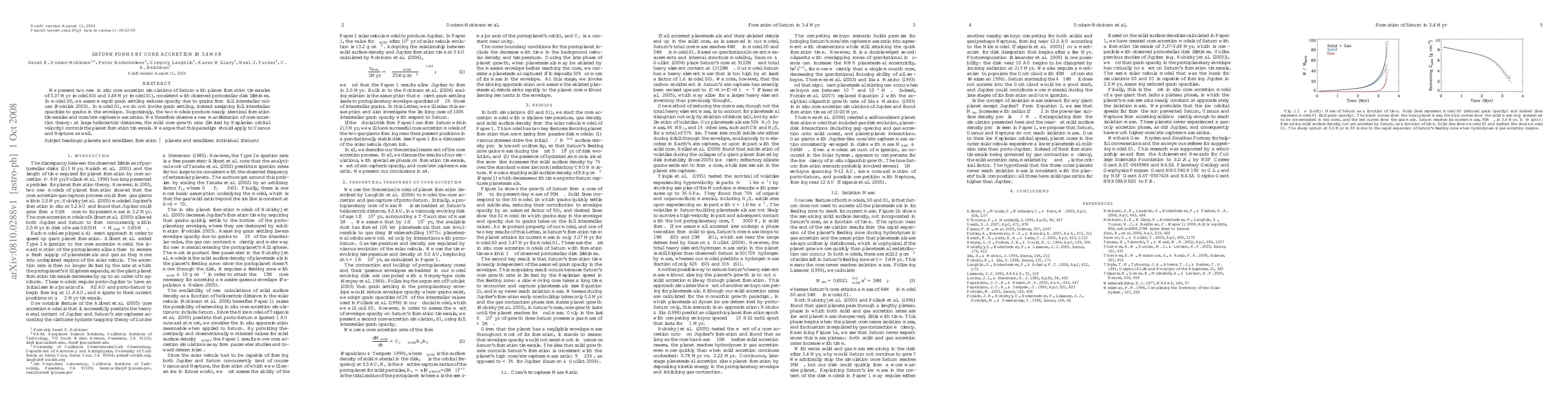 This research presents two core accretion simulations of Saturn's formation, yielding nearly identical timescales of 3.4 Myr despite differing assumptions on grain settling. The study suggests that core growth rate, rather than opacity, governs the formation timescale at large distances, implying a similar mechanism for Uranus and Neptune.