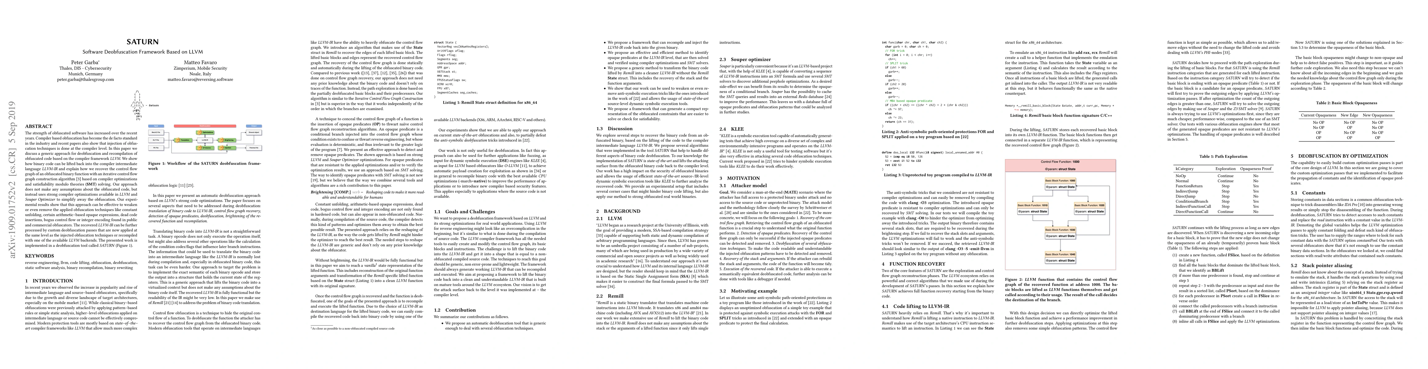 SATURN is a software deobfuscation framework based on the LLVM compiler framework that lifts obfuscated binary code into LLVM-IR, reconstructs control flow graphs, and applies optimizations to simplify obfuscation. This method effectively removes various obfuscation techniques and allows further deobfuscation or recompilation.