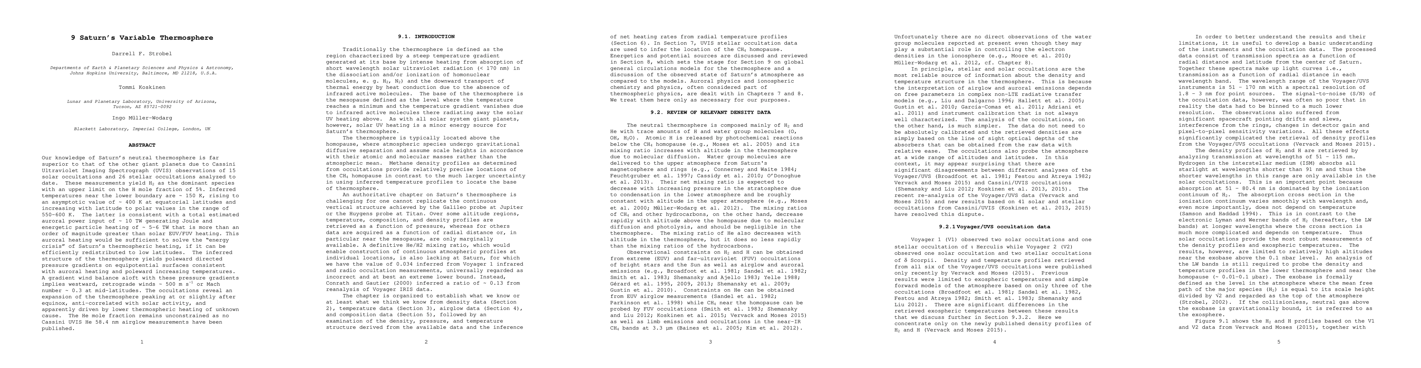 Saturn's thermosphere is heated mainly by auroral activity, with temperatures ranging from 150K to 600K, driven by a mysterious energy source that peeks at equinoxes.