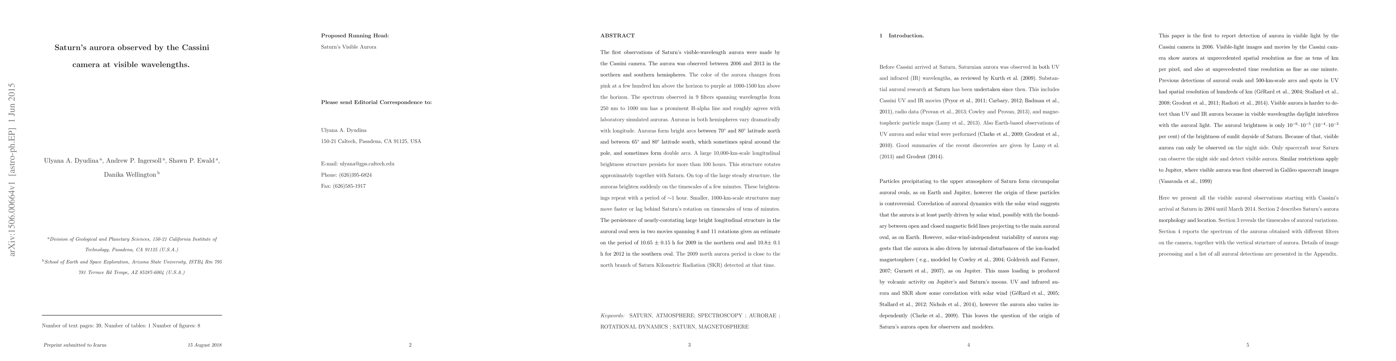 The first observations of Saturn's visible-wavelength aurora were made by the Cassini camera. The aurora was observed between 2006 and 2013 in the northern and southern hemispheres. The color of the aurora changes from pink at a few hundred km above the horizon to purple at 1000-1500 km above the horizon. The spectrum observed in 9 filters spanning wavelengths from 250 nm to 1000 nm has a prominent H-alpha line and roughly agrees with laboratory simulated auroras. Auroras in both hemispheres vary dramatically with longitude. Auroras form bright arcs between 70 and 80 degree latitude north and between 65 and 80 degree latitude south, which sometimes spiral around the pole, and sometimes form double arcs. A large 10,000-km-scale longitudinal brightness structure persists for more than 100 hours. This structure rotates approximately together with Saturn. On top of the large steady structure, the auroras brighten suddenly on the timescales of a few minutes. These brightenings repeat with a period of about 1 hour. Smaller, 1000-km-scale structures may move faster or lag behind Saturn's rotation on timescales of tens of minutes. The persistence of nearly-corotating large bright longitudinal structure in the auroral oval seen in two movies spanning 8 and 11 rotations gives an estimate on the period of 10.65 $\pm$0.15 h for 2009 in the northern oval and 10.8$\pm$ 0.1 h for 2012 in the southern oval. The 2009 north aurora period is close to the north branch of Saturn Kilometric Radiation (SKR) detected at that time.