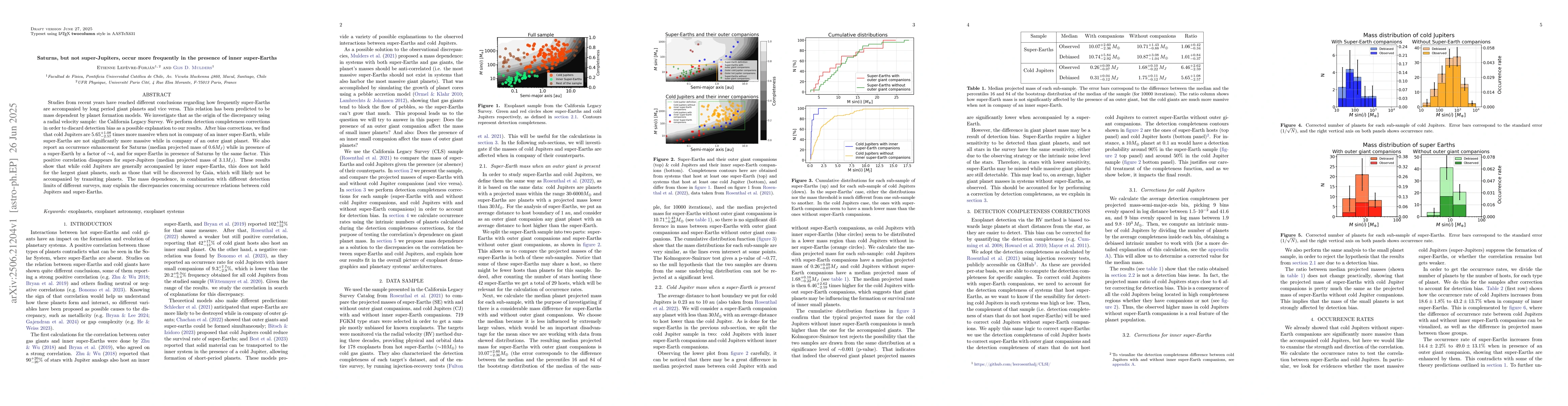 Studies from recent years have reached different conclusions regarding how frequently super-Earths are accompanied by long period giant planets and vice versa. This relation has been predicted to be mass dependent by planet formation models. We investigate that as the origin of the discrepancy using a radial velocity sample: the California Legacy Survey. We perform detection completeness corrections in order to discard detection bias as a possible explanation to our results. After bias corrections, we find that cold Jupiters are 5.65 times more massive when not in company of an inner super-Earth, while super-Earths are not significantly more massive while in company of an outer giant planet. We also report an occurrence enhancement for Saturns (median projected mass of 0.6MJ) while in presence of a super-Earth by a factor of 4, and for super-Earths in presence of Saturns by the same factor. This positive correlation disappears for super-Jupiters (median projected mass of 3.1MJ). These results show that while cold Jupiters are generally accompanied by inner super-Earths, this does not hold for the largest giant planets, such as those that will be discovered by Gaia, which will likely not be accompanied by transiting planets. The mass dependence, in combination with different detection limits of different surveys, may explain the discrepancies concerning occurrence relations between cold Jupiters and super-Earths.