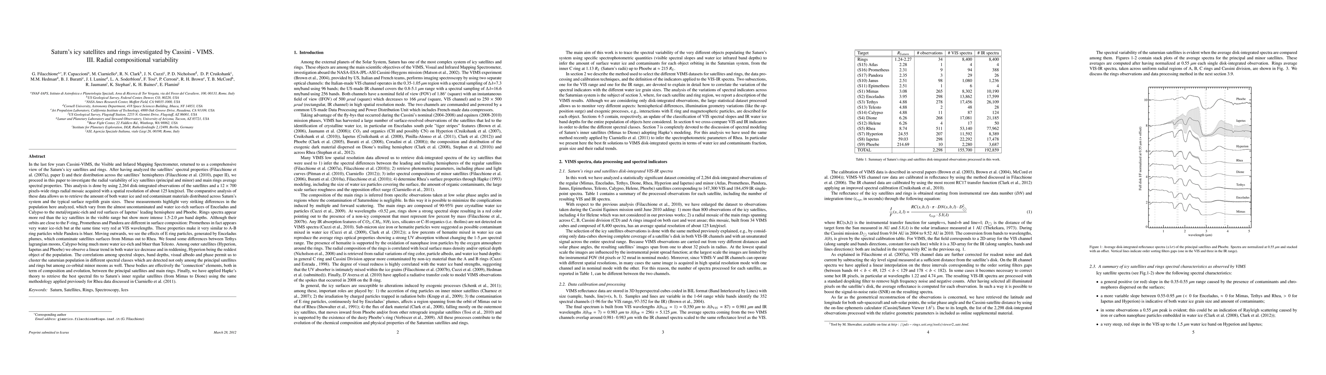 This paper investigates the radial compositional variability of Saturn's icy satellites and rings using Cassini-VIMS data, revealing significant differences in water ice and red contaminant materials across the system. The study clusters the saturnian population into spectral classes based on spectral properties, revealing distinct characteristics among major satellites and rings.