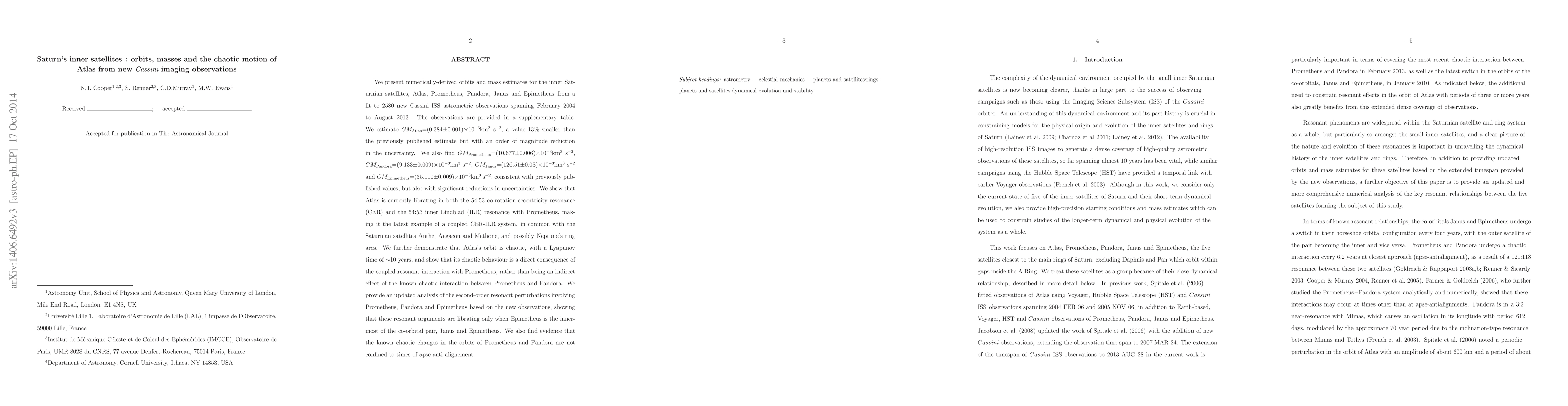 This paper presents refined orbits and mass estimates for Saturn's inner satellites, including Atlas, Prometheus, Pandora, Janus, and Epimetheus, derived from new Cassini imaging data. Atlas exhibits chaotic orbital behavior due to its coupled resonance with Prometheus, leading to a significant reduction in uncertainty for its mass estimate.