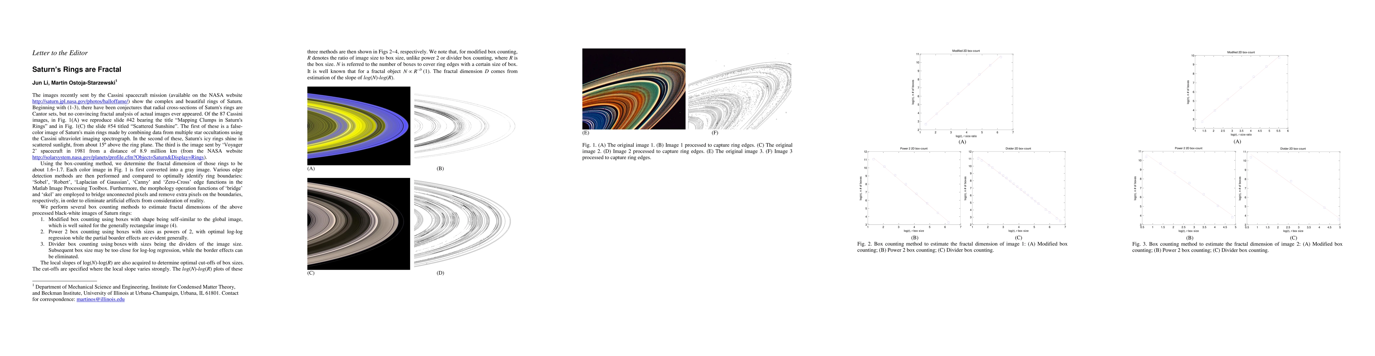 This study analyzes images from the Cassini spacecraft to determine the fractal dimension of Saturn's rings, finding it to be approximately 1.6-1.7, thus supporting the long-standing conjecture that Saturn's rings exhibit fractal characteristics.