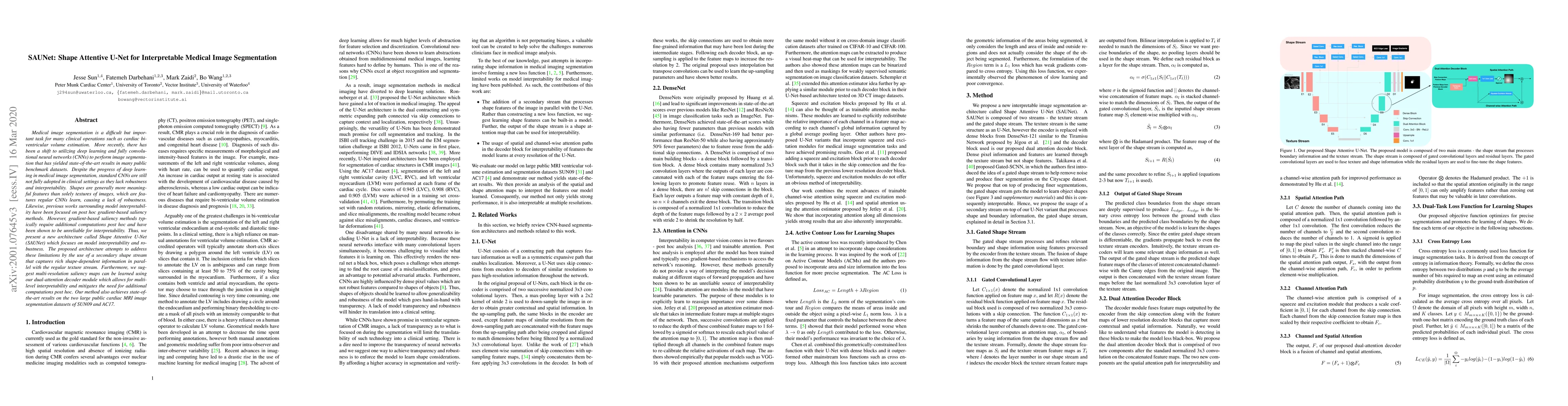The SAUNet architecture introduces a shape-attentive U-Net for medical image segmentation, combining a secondary shape stream with a texture stream to enhance robustness and interpretability. The dual-attention decoder module enables multi-resolution saliency maps, achieving state-of-the-art results on cardiac MRI datasets.