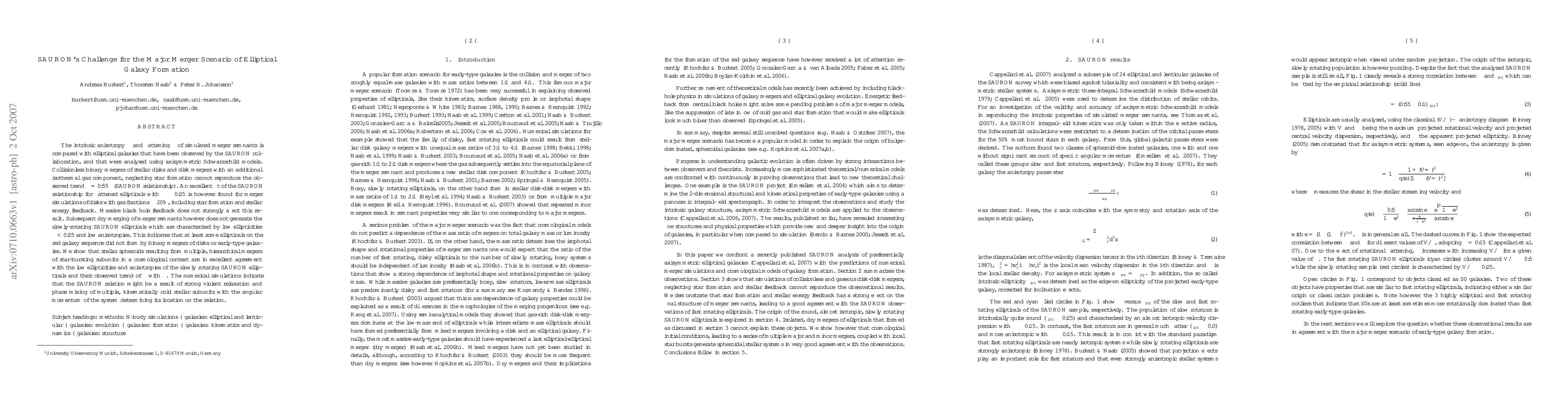 The intrinsic anisotropy delta and flattening epsilon of simulated merger remnants is compared with elliptical galaxies that have been observed by the SAURON collaboration, and that were analysed using axisymmetric Schwarzschild models. Collisionless binary mergers of stellar disks and disk mergers with an additional isothermal gas component, neglecting star formation cannot reproduce the observed trend delta = 0.55 epsilon (SAURON relationship). An excellent fit of the SAURON relationship for flattened ellipticals with epsilon >= 0.25 is however found for merger simulations of disks with gas fractions >= 20%, including star formation and stellar energy feedback. Massive black hole feedback does not strongly affect this result. Subsequent dry merging of merger remnants however does not generate the slowly-rotating SAURON ellipticals which are characterized by low ellipticities epsilon < 0.25 and low anisotropies. This indicates that at least some ellipticals on the red galaxy sequence did not form by binary mergers of disks or early-type galaxies. We show that stellar spheroids resulting from multiple, hierarchical mergers of star-bursting subunits in a cosmological context are in excellent agreement with the low ellipticities and anisotropies of the slowly rotating SAURON ellipticals and their observed trend of delta with epsilon. The numerical simulations indicate that the SAURON relation might be a result of strong violent relaxation and phase mixing of multiple, kinematically cold stellar subunits with the angular momentum of the system determining its location on the relation.