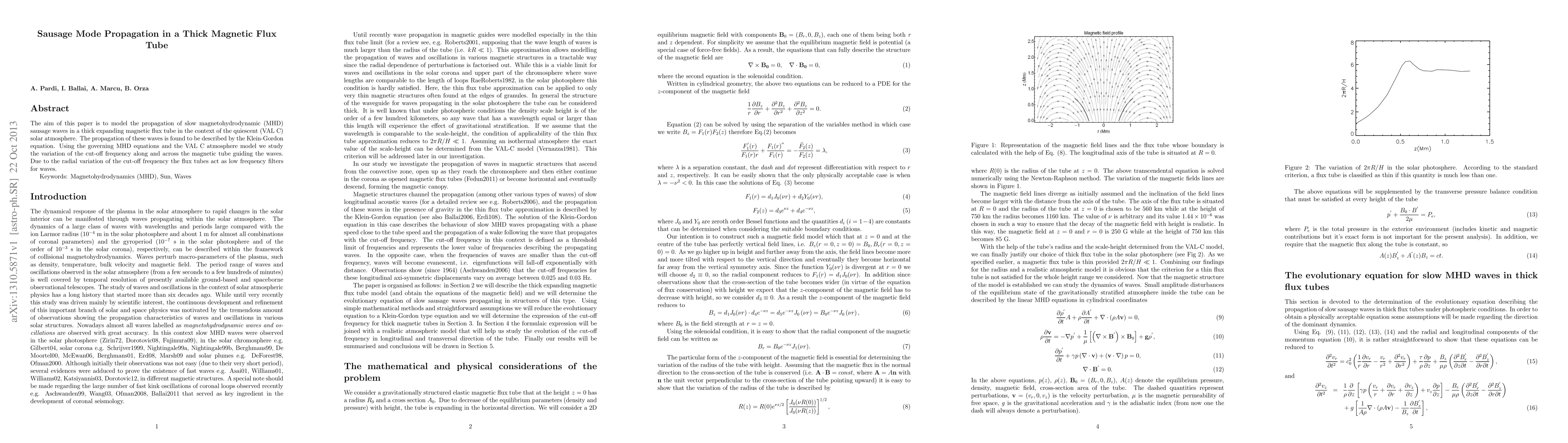 This paper models the propagation of slow magnetohydrodynamic sausage waves in thick expanding magnetic flux tubes in the solar atmosphere, finding their behavior described by the Klein-Gordon equation. It examines how the radial variation of the cut-off frequency acts as a low-frequency filter for these waves.