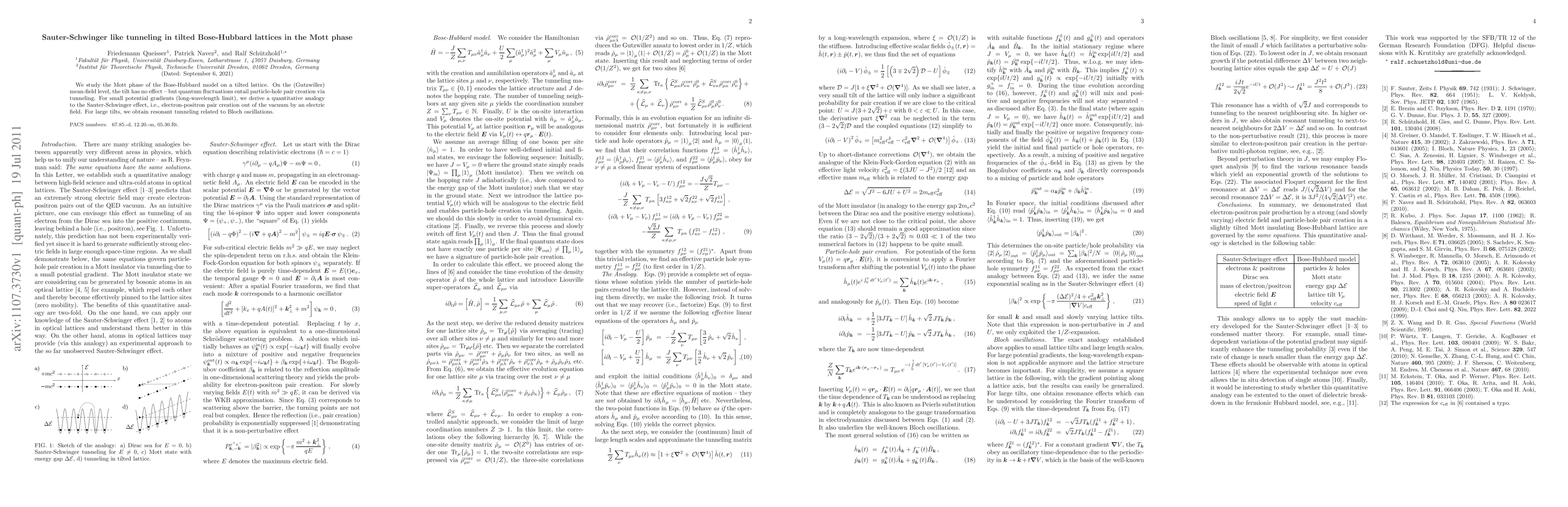 The paper presents a detailed mathematical derivation linking the Sauter-Schwinger effect to particle-hole pair creation in a tilted Bose-Hubbard lattice, introducing an effective equation for particle-hole operators.