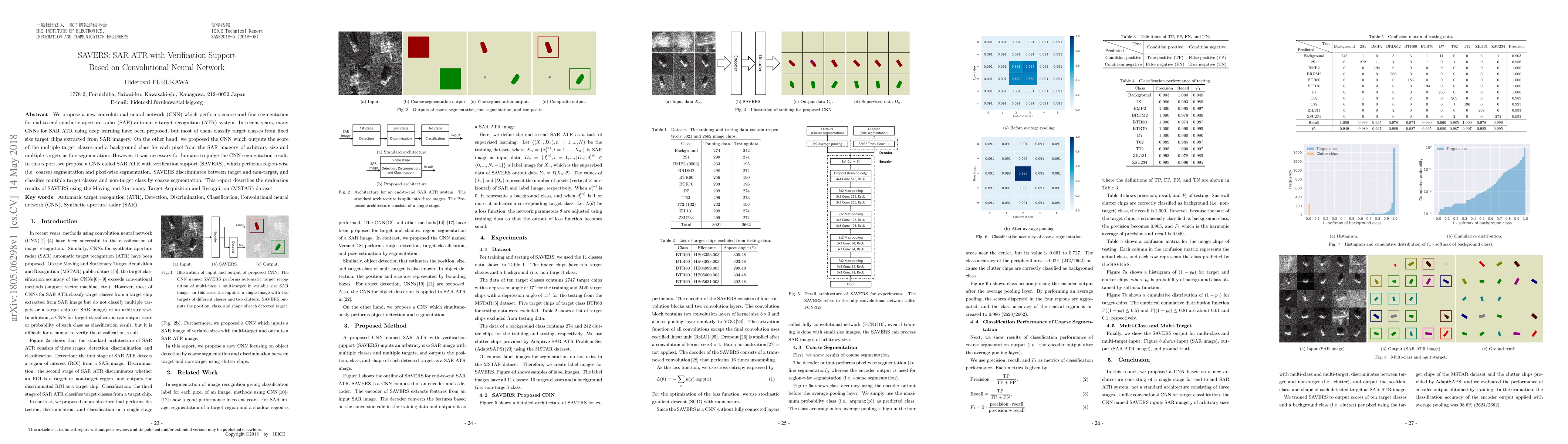 The paper introduces SAVERS, a convolutional neural network for SAR automatic target recognition that performs both coarse and fine segmentation. It outputs scores for multiple target classes and background for each pixel, enabling flexible processing of SAR imagery of arbitrary size, and includes verification support for human judgment. Evaluation results on the MSTAR dataset are presented.