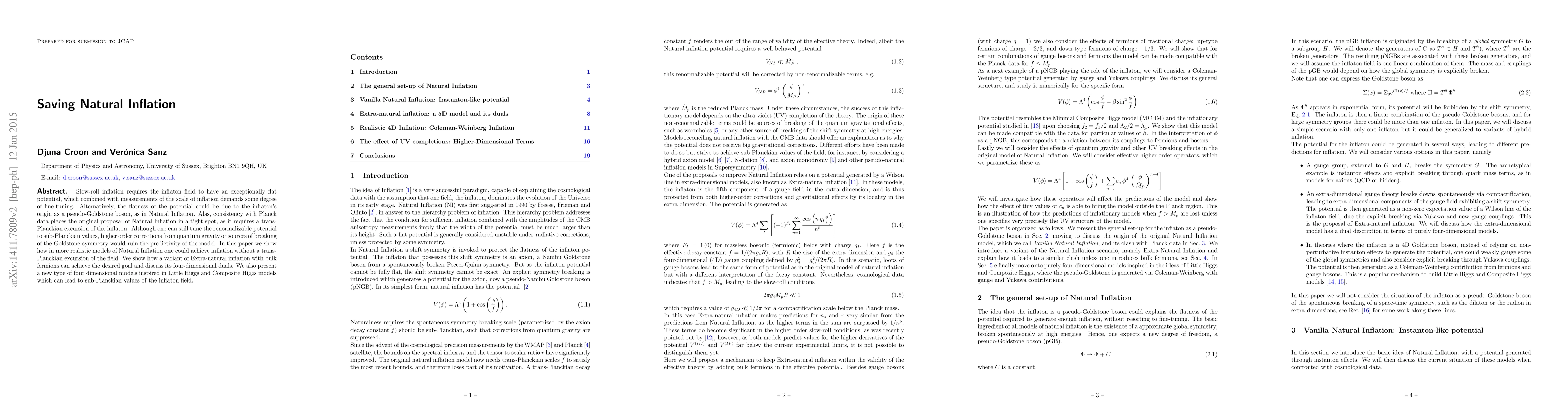 Slow-roll inflation requires the inflaton field to have an exceptionally flat potential, which combined with measurements of the scale of inflation demands some degree of fine-tuning. Alternatively, the flatness of the potential could be due to the inflaton's origin as a pseudo-Goldstone boson, as in Natural Inflation. Alas, consistency with Planck data places the original proposal of Natural Inflation in a tight spot, as it requires a trans-Planckian excursion of the inflaton. Although one can still tune the renormalizable potential to sub-Planckian values, higher order corrections from quantum gravity or sources of breaking of the Goldstone symmetry would ruin the predictivity of the model. In this paper we show how in more realistic models of Natural Inflation one could achieve inflation without a trans-Planckian excursion of the field. We show how a variant of Extra-natural inflation with bulk fermions can achieve the desired goal and discuss its four-dimensional duals. We also present a new type of four dimensional models inspired in Little Higgs and Composite Higgs models which can lead to sub-Planckian values of the inflaton field.