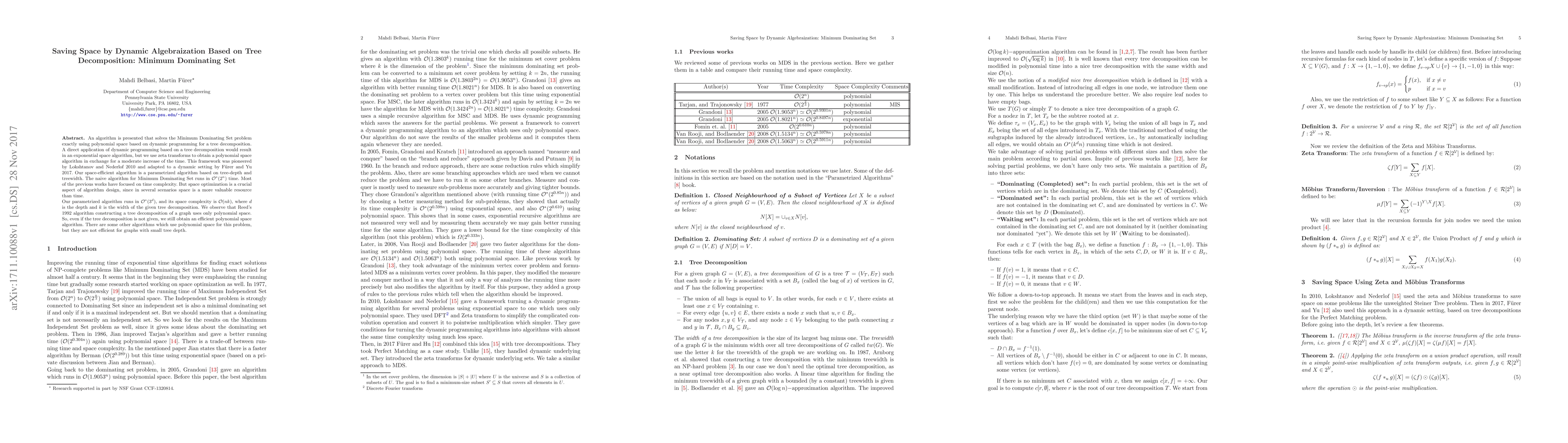 An algorithm is presented that solves the Minimum Dominating Set problem exactly using polynomial space based on dynamic programming for a tree decomposition. A direct application of dynamic programming based on a tree decomposition would result in an exponential space algorithm, but we use zeta transforms to obtain a polynomial space algorithm in exchange for a moderate increase of the time. This framework was pioneered by Lokshtanov and Nederlof 2010 and adapted to a dynamic setting by F\"urer and Yu 2017. Our space-efficient algorithm is a parametrized algorithm based on tree-depth and treewidth. The naive algorithm for Minimum Dominating Set runs in $\mathcal{O}^*(2^n)$ time. Most of the previous works have focused on time complexity. But space optimization is a crucial aspect of algorithm design, since in several scenarios space is a more valuable resource than time. Our parametrized algorithm runs in $\mathcal{O}^*(3^{d})$, and its space complexity is $\mathcal{O}(nk)$, where $d$ is the depth and $k$ is the width of the given tree decomposition. We observe that Reed's 1992 algorithm constructing a tree decomposition of a graph uses only polynomial space. So, even if the tree decomposition is not given, we still obtain an efficient polynomial space algorithm. There are some other algorithms which use polynomial space for this problem, but they are not efficient for graphs with small tree depth.