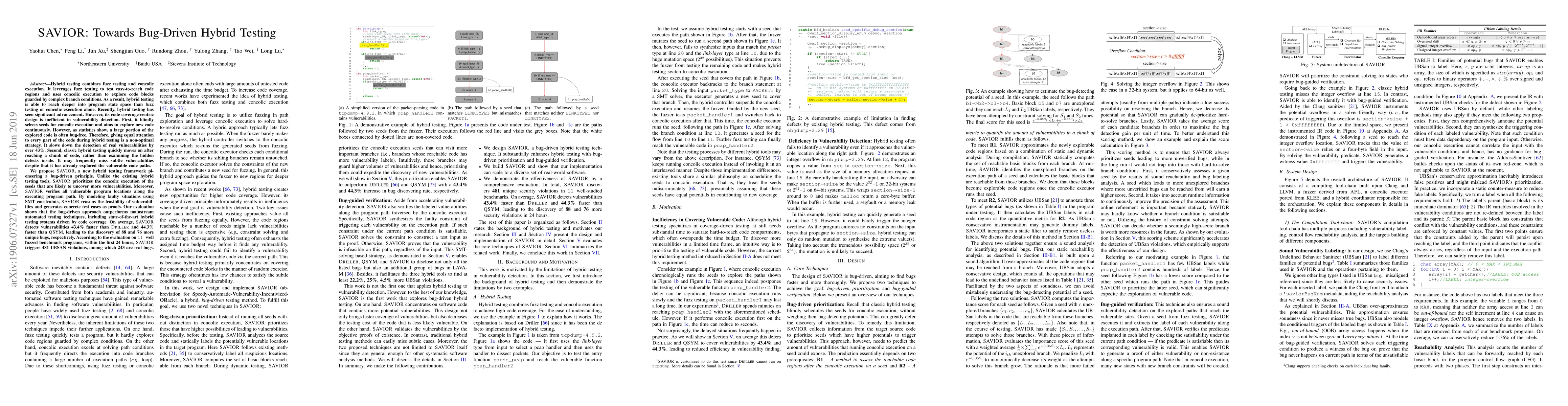 Hybrid testing combines fuzz testing and concolic execution. It leverages fuzz testing to test easy-to-reach code regions and uses concolic execution to explore code blocks guarded by complex branch conditions. However, its code coverage-centric design is inefficient in vulnerability detection. First, it blindly selects seeds for concolic execution and aims to explore new code continuously. However, as statistics show, a large portion of the explored code is often bug-free. Therefore, giving equal attention to every part of the code during hybrid testing is a non-optimal strategy. It slows down the detection of real vulnerabilities by over 43%. Second, classic hybrid testing quickly moves on after reaching a chunk of code, rather than examining the hidden defects inside. It may frequently miss subtle vulnerabilities despite that it has already explored the vulnerable code paths. We propose SAVIOR, a new hybrid testing framework pioneering a bug-driven principle. Unlike the existing hybrid testing tools, SAVIOR prioritizes the concolic execution of the seeds that are likely to uncover more vulnerabilities. Moreover, SAVIOR verifies all vulnerable program locations along the executing program path. By modeling faulty situations using SMT constraints, SAVIOR reasons the feasibility of vulnerabilities and generates concrete test cases as proofs. Our evaluation shows that the bug-driven approach outperforms mainstream automated testing techniques, including state-of-the-art hybrid testing systems driven by code coverage. On average, SAVIOR detects vulnerabilities 43.4% faster than DRILLER and 44.3% faster than QSYM, leading to the discovery of 88 and 76 more uniquebugs,respectively.Accordingtotheevaluationon11 well fuzzed benchmark programs, within the first 24 hours, SAVIOR triggers 481 UBSAN violations, among which 243 are real bugs.