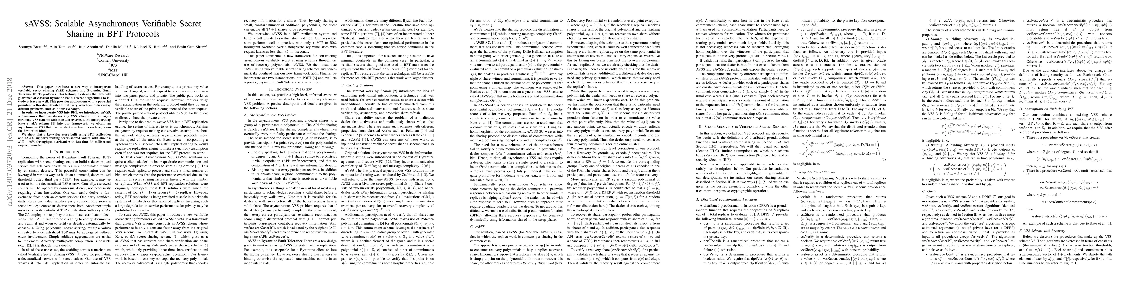 This paper introduces a new way to incorporate verifiable secret sharing (VSS) schemes into Byzantine Fault Tolerance (BFT) protocols. This technique extends the threshold guarantee of classical Byzantine Fault Tolerant algorithms to include privacy as well. This provides applications with a powerful primitive: a threshold trusted third party, which simplifies many difficult problems such as a fair exchange. In order to incorporate VSS into BFT, we introduced sAVSS, a framework that transforms any VSS scheme into an asynchronous VSS scheme with constant overhead. By incorporating Kate et al.'s scheme into our framework, we obtain an asynchronous VSS that has constant overhead on each replica -- the first of its kind. We show that a key-value store built using BFT replication and sAVSS supports writing secret-shared values with about a 30% - 50% throughput overhead with less than 35 millisecond request latencies.