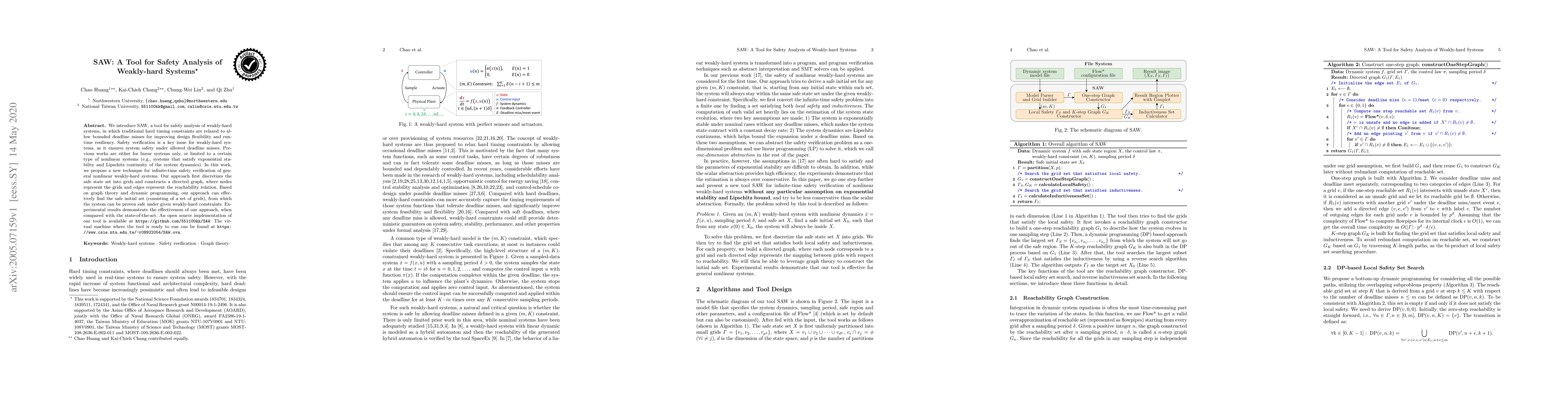 SAW is a novel tool for safety analysis of weakly-hard systems, enabling bounded deadline misses to enhance design flexibility. It employs a new technique for infinite-time safety verification of general nonlinear weakly-hard systems, using graph theory and dynamic programming to find safe initial states.