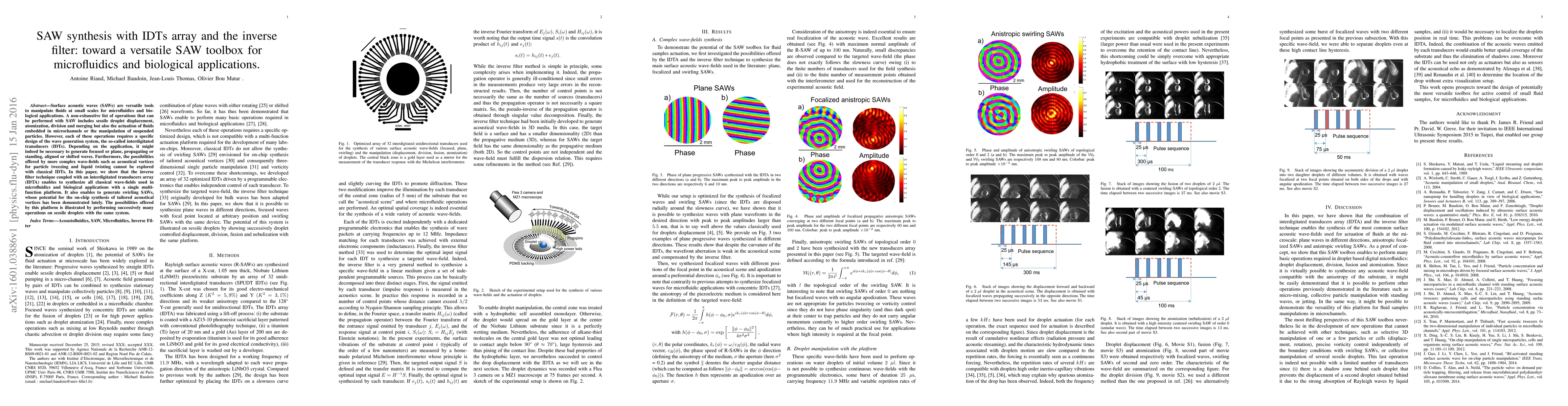 This paper presents a versatile surface acoustic wave (SAW) synthesis method using an interdigitated transducers array (IDTA) and inverse filter technique, enabling the generation of various wave-fields for microfluidics and biological applications. The proposed platform can perform diverse operations on sessile droplets and generate complex acoustical vortices.