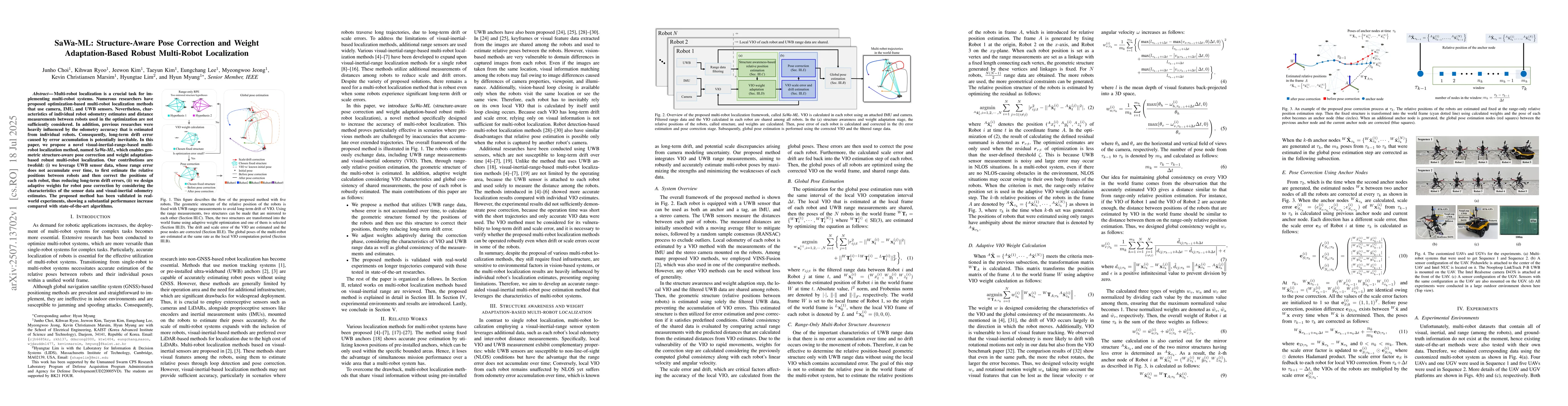 Multi-robot localization is a crucial task for implementing multi-robot systems. Numerous researchers have proposed optimization-based multi-robot localization methods that use camera, IMU, and UWB sensors. Nevertheless, characteristics of individual robot odometry estimates and distance measurements between robots used in the optimization are not sufficiently considered. In addition, previous researches were heavily influenced by the odometry accuracy that is estimated from individual robots. Consequently, long-term drift error caused by error accumulation is potentially inevitable. In this paper, we propose a novel visual-inertial-range-based multi-robot localization method, named SaWa-ML, which enables geometric structure-aware pose correction and weight adaptation-based robust multi-robot localization. Our contributions are twofold: (i) we leverage UWB sensor data, whose range error does not accumulate over time, to first estimate the relative positions between robots and then correct the positions of each robot, thus reducing long-term drift errors, (ii) we design adaptive weights for robot pose correction by considering the characteristics of the sensor data and visual-inertial odometry estimates. The proposed method has been validated in real-world experiments, showing a substantial performance increase compared with state-of-the-art algorithms.