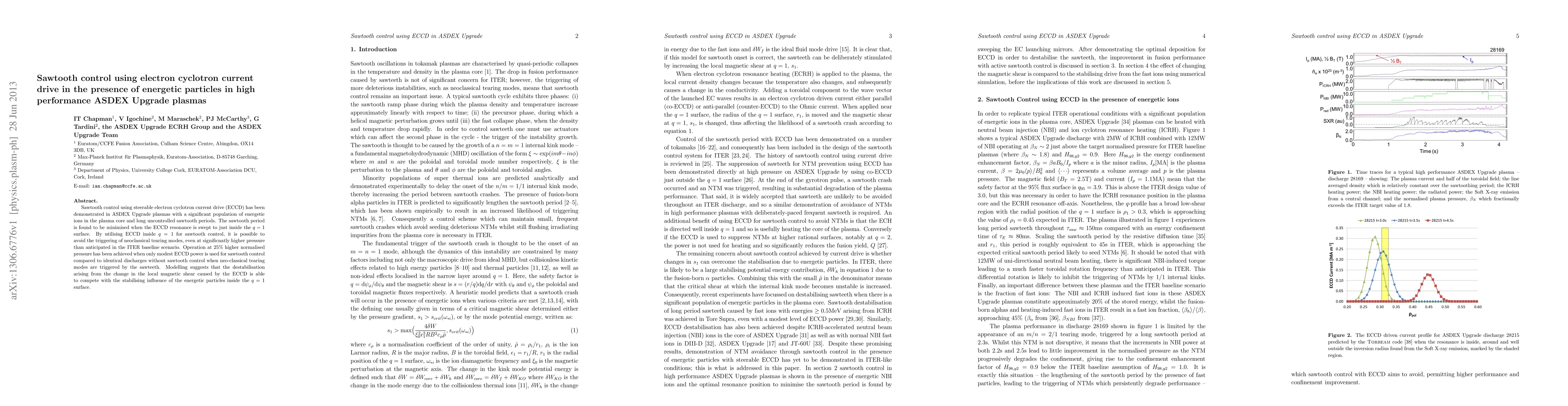 This paper demonstrates that steerable electron cyclotron current drive (ECCD) can effectively control sawtooth oscillations in ASDEX Upgrade plasmas, even with energetic ions, by minimizing the sawtooth period and avoiding neoclassical tearing modes. ECCD inside the q = 1 surface enables operation at higher pressures without triggering these modes.