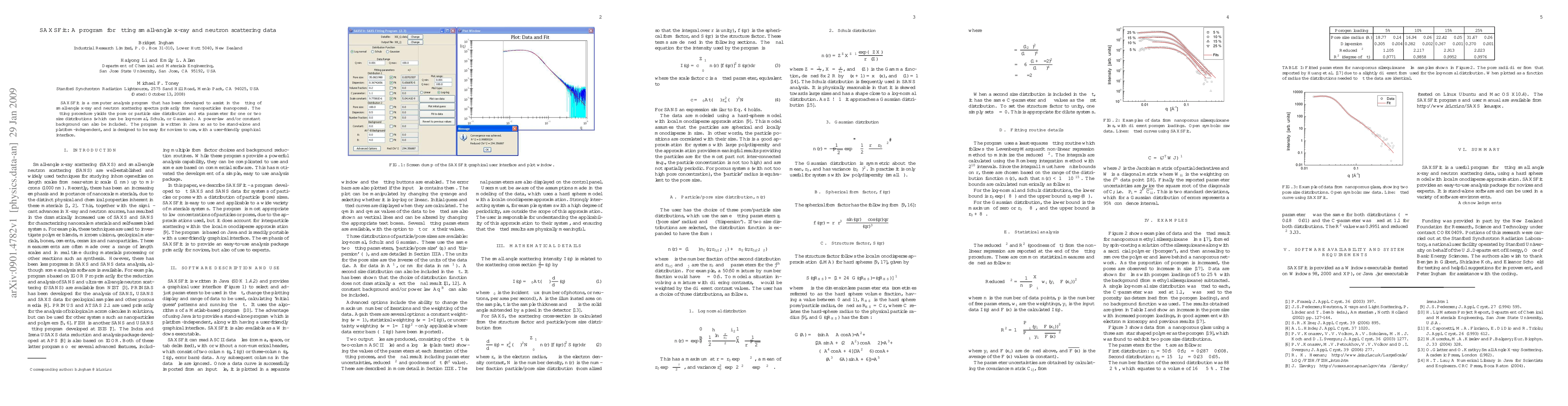 SAXSFit is a Java-based program for fitting small-angle x-ray and neutron scattering data, primarily for analyzing nanoparticle size distributions. It offers a user-friendly interface for fitting log-normal, Schulz, or Gaussian distributions, and includes options for background correction.