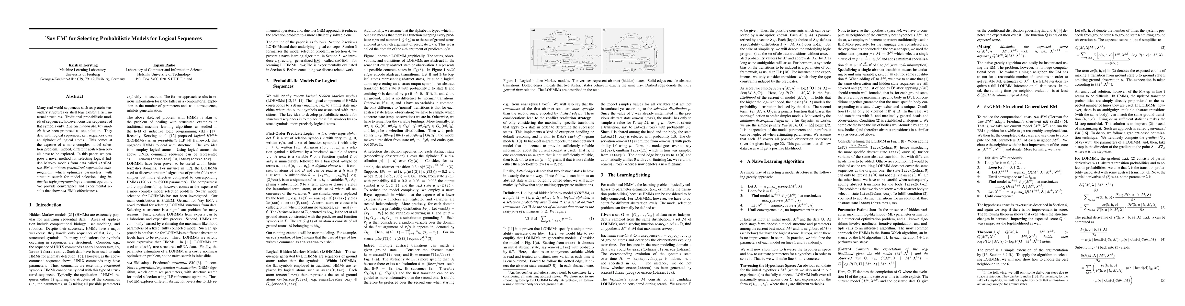 This paper introduces SAGEM, a novel method for selecting logical hidden Markov models from data, combining generalized expectation maximization with structure search using inductive logic programming to optimize both parameters and model structure, demonstrating its effectiveness through convergence and empirical results.