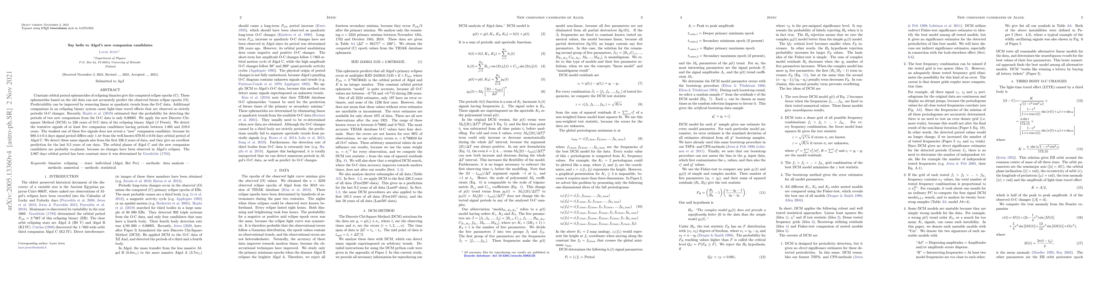 Constant orbital period ephemerides of eclipsing binaries give the computed eclipse epochs (C). These ephemerides based on the old data can not accurately predict the observed future eclipse epochs (O). Predictability can be improved by removing linear or quadratic trends from the O-C data. Additional companions in an eclipsing binary system cause light-time travel effects that are observed as strictly periodic O-C changes. Recently, Hajdu et al. (2019) estimated that the probability for detecting the periods of two new companions from the O-C data is only 0.00005. We apply the new Discrete Chi-square Method (DCM) to 236 years of O-C data of the eclipsing binary Algol ($\beta$ Persei). We detect the tentative signals of at least five companion candidates having periods between 1.863 and 219.0 years. The weakest one of these five signals does not reveal a "new" companion candidate, because its $680.4 \pm 0.4$ days signal period differs only $1.4 \sigma$ from the well-known $679.85 \pm 0.04$ days orbital period of Algol~C. We detect these same signals also from the first 226.2 years of data, and they give an excellent prediction for the last 9.2 years of our data. The orbital planes of Algol~C and the new companion candidates are probably co-planar, because no changes have been observed in Algol's eclipses. The 2.867 days orbital period has been constant since it was determined by Goodricke (1783).