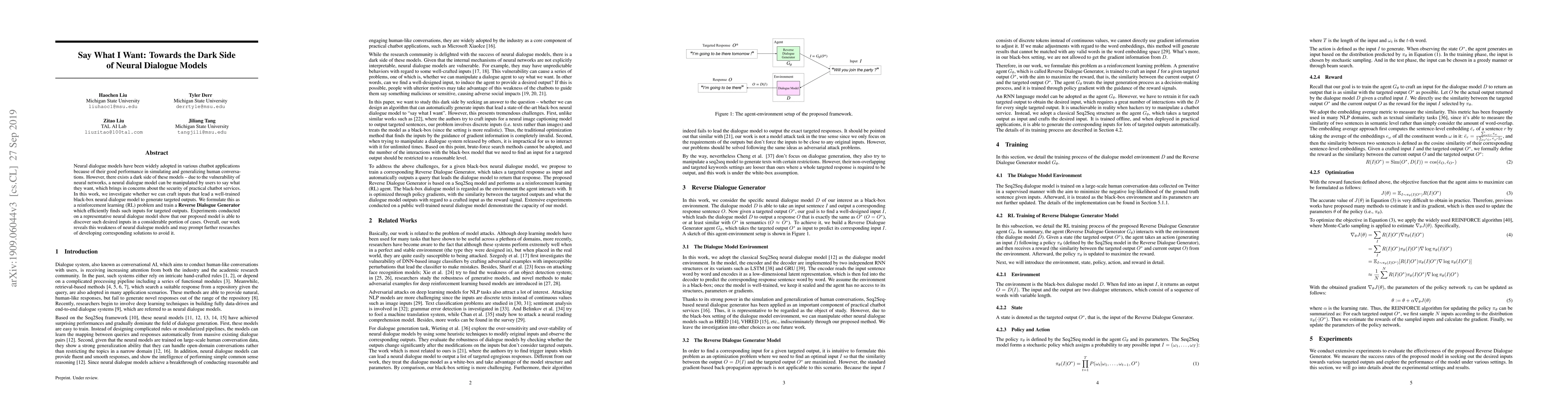Neural dialogue models have been widely adopted in various chatbot applications because of their good performance in simulating and generalizing human conversations. However, there exists a dark side of these models -- due to the vulnerability of neural networks, a neural dialogue model can be manipulated by users to say what they want, which brings in concerns about the security of practical chatbot services. In this work, we investigate whether we can craft inputs that lead a well-trained black-box neural dialogue model to generate targeted outputs. We formulate this as a reinforcement learning (RL) problem and train a Reverse Dialogue Generator which efficiently finds such inputs for targeted outputs. Experiments conducted on a representative neural dialogue model show that our proposed model is able to discover such desired inputs in a considerable portion of cases. Overall, our work reveals this weakness of neural dialogue models and may prompt further researches of developing corresponding solutions to avoid it.