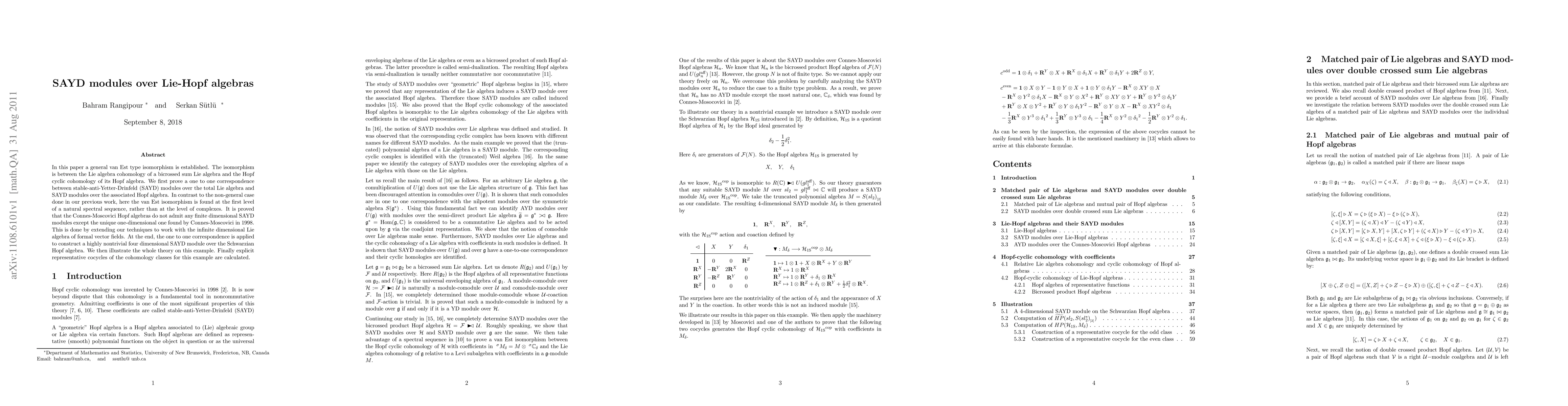 In this paper a general van Est type isomorphism is established. The isomorphism is between the Lie algebra cohomology of a bicrossed sum Lie algebra and the Hopf cyclic cohomology of its Hopf algebra. We first prove a one to one correspondence between stable-anti-Yetter-Drinfeld (SAYD) modules over the total Lie algebra and SAYD modules over the associated Hopf algebra. In contrast to the non-general case done in our previous work, here the van Est isomorphism is found at the first level of a natural spectral sequence, rather than at the level of complexes. It is proved that the Connes-Moscovici Hopf algebras do not admit any finite dimensional SAYD modules except the unique one-dimensional one found by Connes- Moscovici in 1998. This is done by extending our techniques to work with the infinite dimensional Lie algebra of formal vector fields. At the end, the one to one correspondence is applied to construct a highly nontrivial four dimensional SAYD module over the Schwarzian Hopf algebra. We then illustrate the whole theory on this example. Finally explicit representative cocycles of the cohomology classes for this example are calculated.