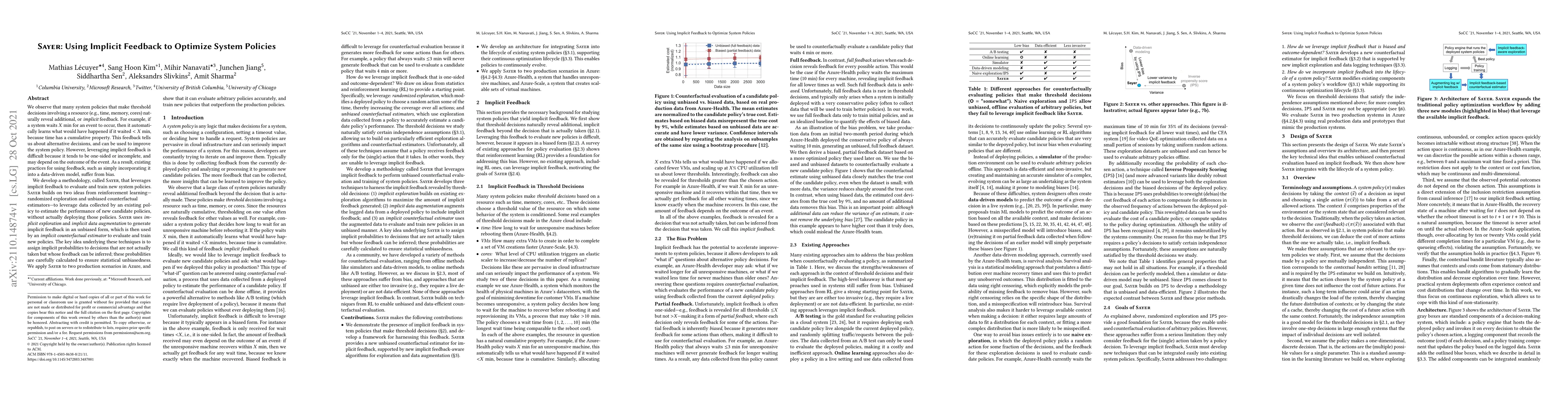 Sayer leverages implicit feedback from existing system policies to improve decision-making without deploying new policies. It employs randomized exploration and unbiased counterfactual estimators to generate and evaluate new policies, demonstrating improved performance in Azure production scenarios.
