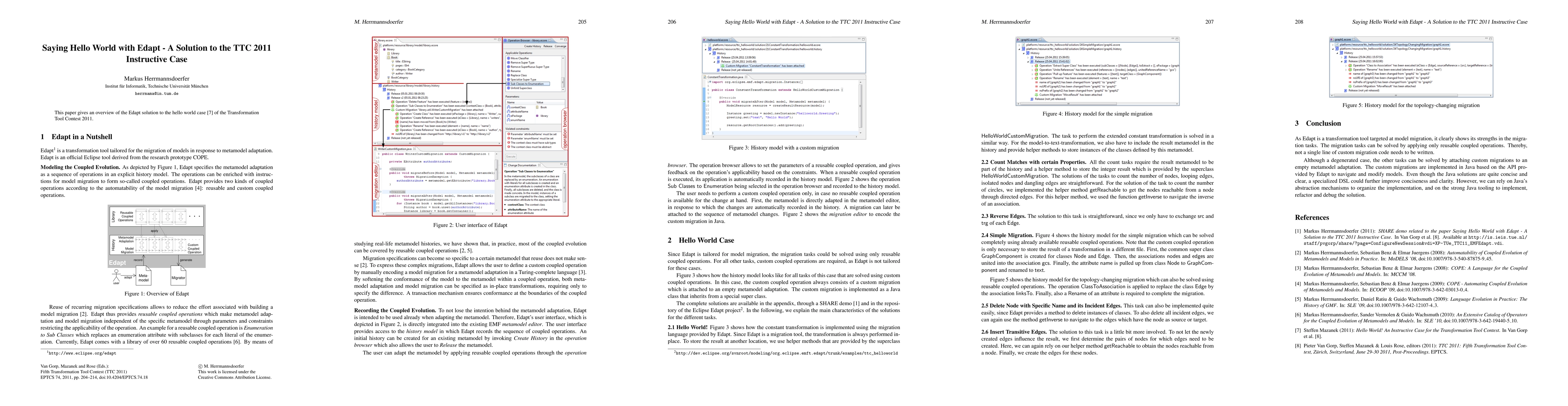 Summary: This paper presents Edapt's solution for the "hello world" instructive case in the Transformation Tool Contest 2011, providing an overview of the approach and its implementation.