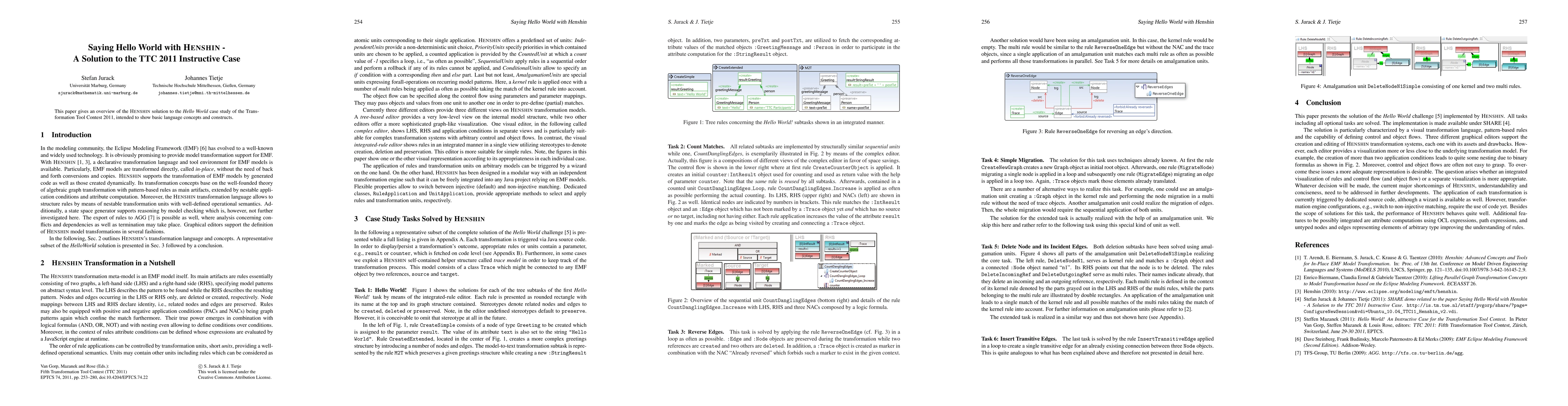 This paper presents Henshin's solution to the TTC 2011 Hello World case study, demonstrating fundamental language concepts and constructs through a practical transformation tool application.