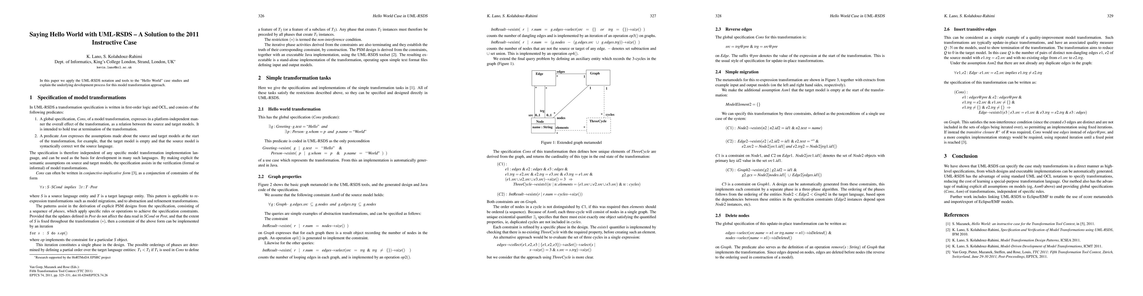 In this paper we apply the UML-RSDS notation and tools to the "Hello World" case studies and explain the underlying development process for this model transformation approach.