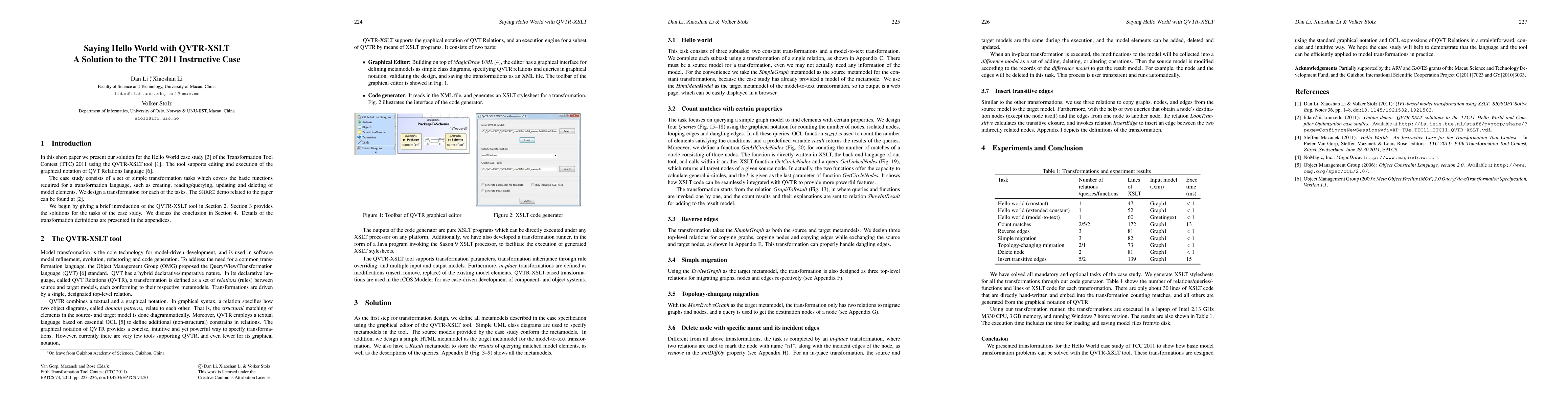 This paper presents a solution for the TTC 2011 Hello World case study using the QVTR-XSLT tool, which facilitates graphical editing and execution of QVT Relations. The study covers basic transformation functions including creation, reading, updating, and deletion of model elements.