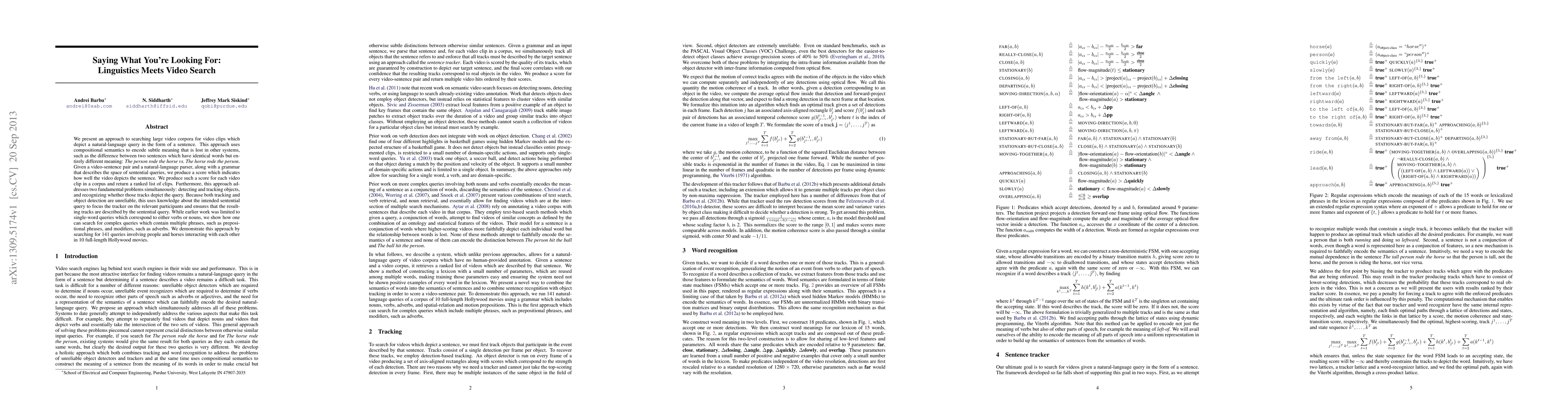 We present an approach to searching large video corpora for video clips which depict a natural-language query in the form of a sentence. This approach uses compositional semantics to encode subtle meaning that is lost in other systems, such as the difference between two sentences which have identical words but entirely different meaning: "The person rode the horse} vs. \emph{The horse rode the person". Given a video-sentence pair and a natural-language parser, along with a grammar that describes the space of sentential queries, we produce a score which indicates how well the video depicts the sentence. We produce such a score for each video clip in a corpus and return a ranked list of clips. Furthermore, this approach addresses two fundamental problems simultaneously: detecting and tracking objects, and recognizing whether those tracks depict the query. Because both tracking and object detection are unreliable, this uses knowledge about the intended sentential query to focus the tracker on the relevant participants and ensures that the resulting tracks are described by the sentential query. While earlier work was limited to single-word queries which correspond to either verbs or nouns, we show how one can search for complex queries which contain multiple phrases, such as prepositional phrases, and modifiers, such as adverbs. We demonstrate this approach by searching for 141 queries involving people and horses interacting with each other in 10 full-length Hollywood movies.