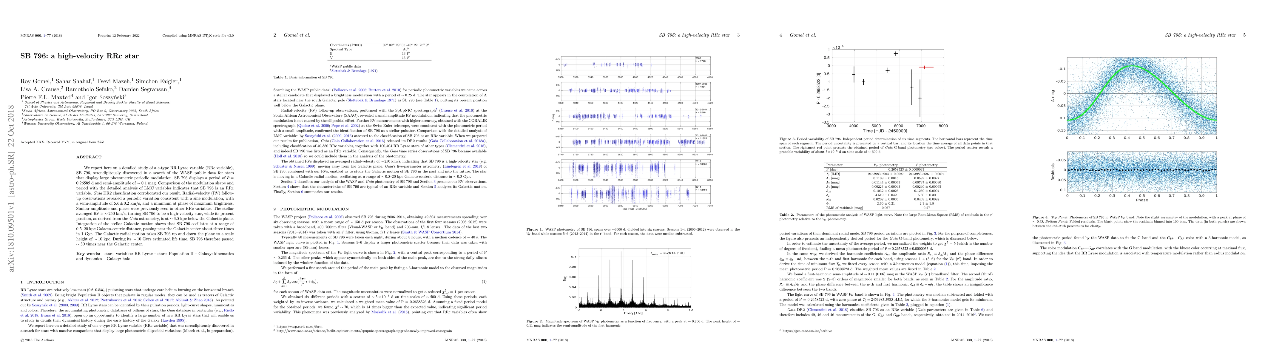 We report here on a detailed study of a c-type RR Lyrae variable (RRc variable), SB 796, serendipitously discovered in a search of the WASP public data for stars that display large photometric periodic modulation. SB 796 displays a period of $P = 0.26585$ d and semi-amplitude of $\sim$ 0.1 mag. Comparison of the modulation shape and period with the detailed analysis of LMC variables indicates that SB 796 is an RRc variable. Gaia DR2 classification corroborated our result. Radial-velocity (RV) follow-up observations revealed a periodic variation consistent with a sine modulation, with a semi-amplitude of $5.6\pm0.2$ km/s, and a minimum at phase of maximum brightness. Similar amplitude and phase were previously seen in other RRc variables. The stellar averaged RV is $\sim 250$ km/s, turning SB 796 to be a high-velocity star, while its present position, as derived from the Gaia astrometry, is at $\sim 3.5$ kpc below the Galactic plane. Integration of the stellar Galactic motion shows that SB 796 oscillates at a range of 0.5--20 kpc Galacto-centric distance, passing near the Galactic center about three times in 1 Gyr. The Galactic radial motion takes SB 796 up and down the plane to a scale height of $\sim 10$ kpc. During its $\sim10$ Gyrs estimated life time, SB 796 therefore passed $\sim 30$ times near the Galactic center.