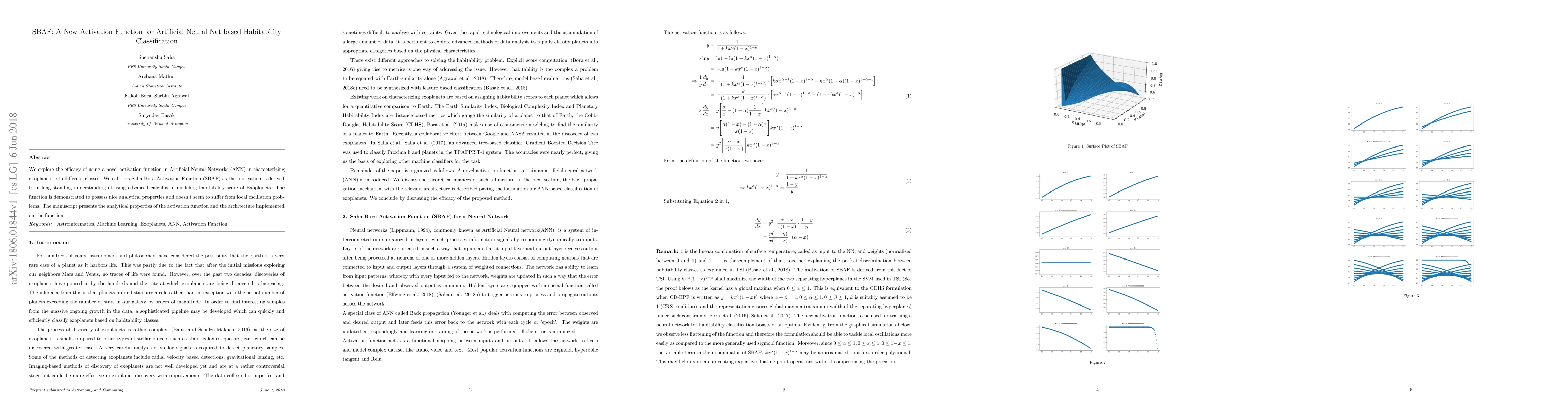 We explore the efficacy of using a novel activation function in Artificial Neural Networks (ANN) in characterizing exoplanets into different classes. We call this Saha-Bora Activation Function (SBAF) as the motivation is derived from long standing understanding of using advanced calculus in modeling habitability score of Exoplanets. The function is demonstrated to possess nice analytical properties and doesn't seem to suffer from local oscillation problems. The manuscript presents the analytical properties of the activation function and the architecture implemented on the function. Keywords: Astroinformatics, Machine Learning, Exoplanets, ANN, Activation Function.