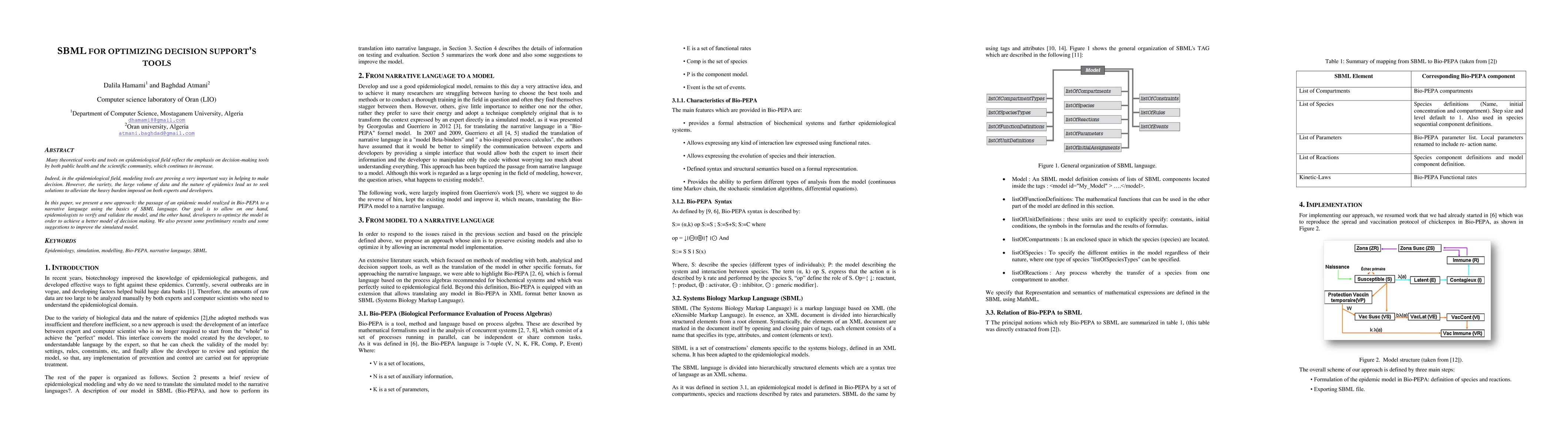 Many theoretical works and tools on epidemiological field reflect the emphasis on decision-making Tools by both public health and the scientific community, which continues to increase. Indeed, in the epidemiological field, modeling tools are proving a very important way in helping to make decision. However, the variety, the large volume of data and the nature of epidemics lead us to seek solutions to alleviate the heavy burden imposed on both experts and developers. In this paper, we present a new approach: the passage of an epidemic model realized in Bio-PEPA to a narrative language using the basics of SBML language. Our goal is to allow on one hand, epidemiologists to verify and validate the model, and the other hand, developers to optimize the model in order to achieve a better model of decision making. We also present some preliminary results and some suggestions to improve the simulated model.