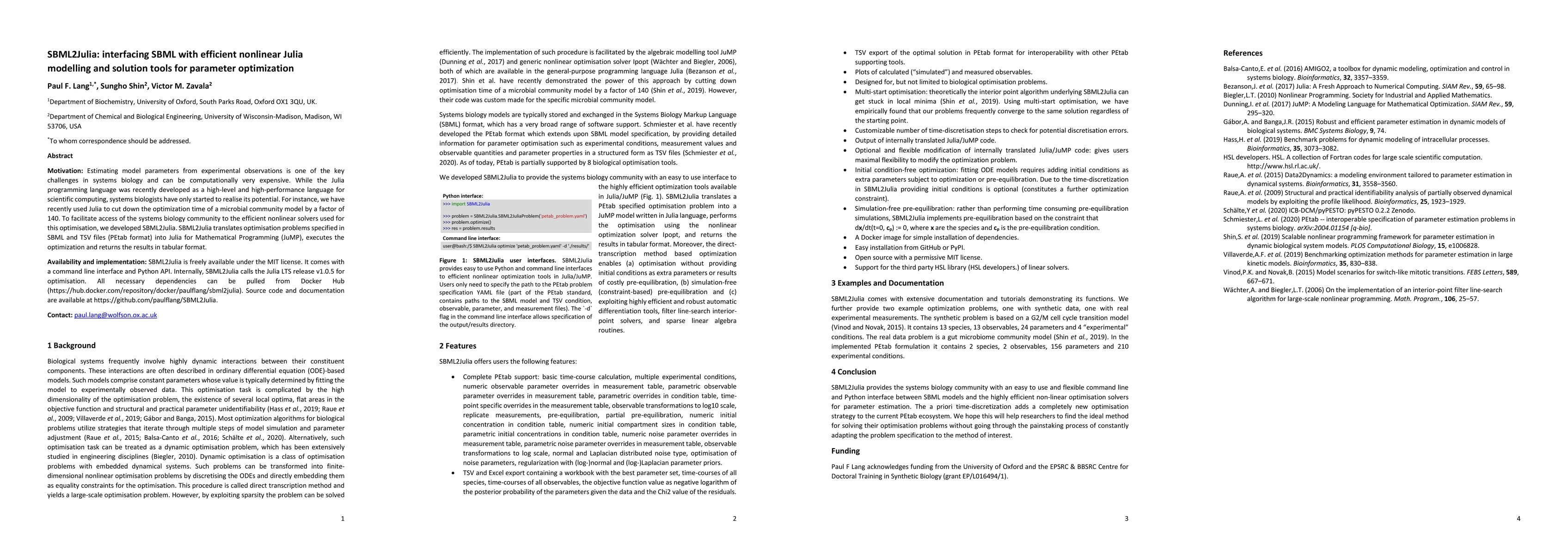 Motivation: Estimating model parameters from experimental observations is one of the key challenges in systems biology and can be computationally very expensive. While the Julia programming language was recently developed as a high-level and high-performance language for scientific computing, systems biologists have only started to realise its potential. For instance, we have recently used Julia to cut down the optimization time of a microbial community model by a factor of 140. To facilitate access of the systems biology community to the efficient nonlinear solvers used for this optimisation, we developed SBML2Julia. SBML2Julia translates optimisation problems specified in SBML and TSV files (PEtab format) into Julia for Mathematical Programming (JuMP), executes the optimization and returns the results in tabular format. Availability and implementation: SBML2Julia is freely available under the MIT license. It comes with a command line interface and Python API. Internally, SBML2Julia calls the Julia LTS release v1.0.5 for optimisation. All necessary dependencies can be pulled from Docker Hub (https://hub.docker.com/repository/docker/paulflang/sbml2julia). Source code and documentation are available at https://github.com/paulflang/SBML2Julia.