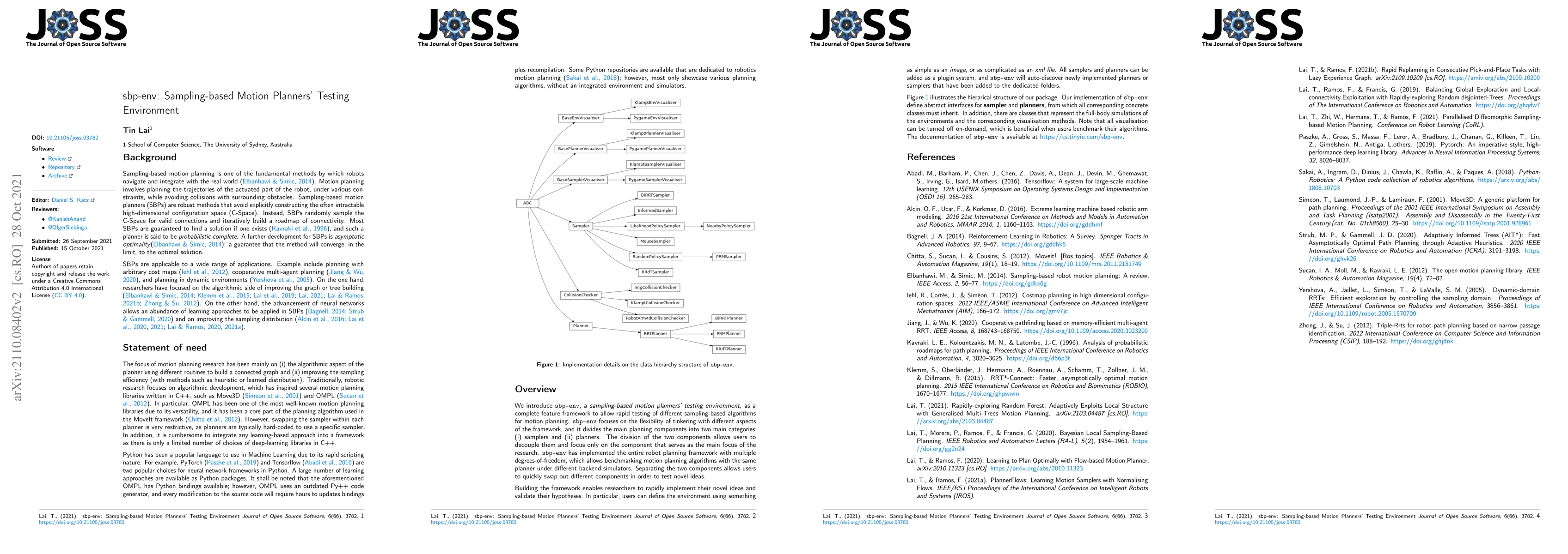 Sampling-based motion planners' testing environment (sbp-env) is a full feature framework to quickly test different sampling-based algorithms for motion planning. sbp-env focuses on the flexibility of tinkering with different aspects of the framework, and had divided the main planning components into two categories (i) samplers and (ii) planners. The focus of motion planning research had been mainly on (i) improving the sampling efficiency (with methods such as heuristic or learned distribution) and (ii) the algorithmic aspect of the planner using different routines to build a connected graph. Therefore, by separating the two components one can quickly swap out different components to test novel ideas.