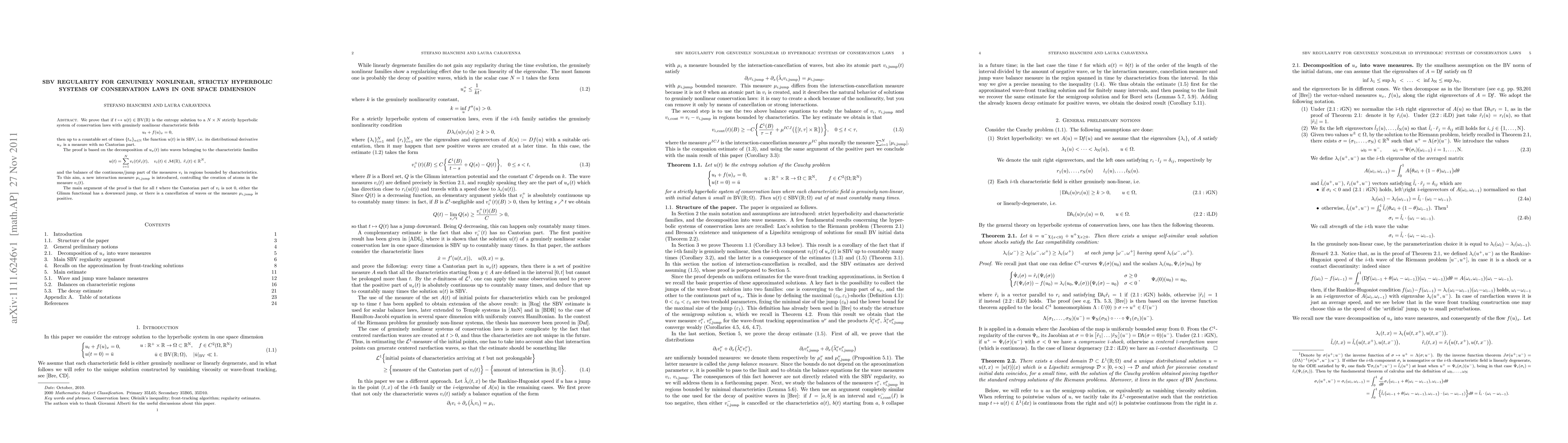 This paper proves that entropy solutions to strictly hyperbolic systems of conservation laws with genuinely nonlinear characteristics are SBV almost everywhere, excluding a countable set of times. The proof leverages a decomposition of the solution into characteristic waves and introduces an interaction measure to control the formation of singularities.