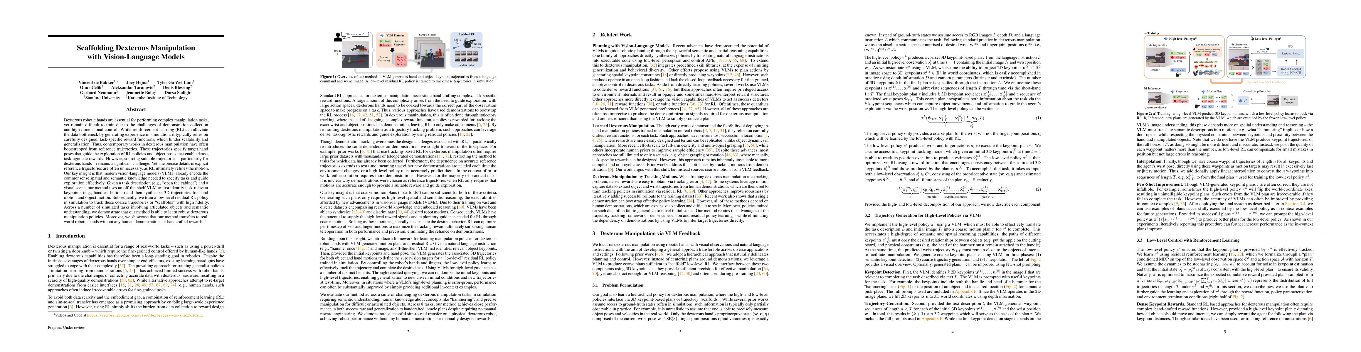 The work distinguishes itself by integrating VLMs for high-level task understanding and low-level control refinement, bypassing the need for task-specific reward functions and human demonstrations.