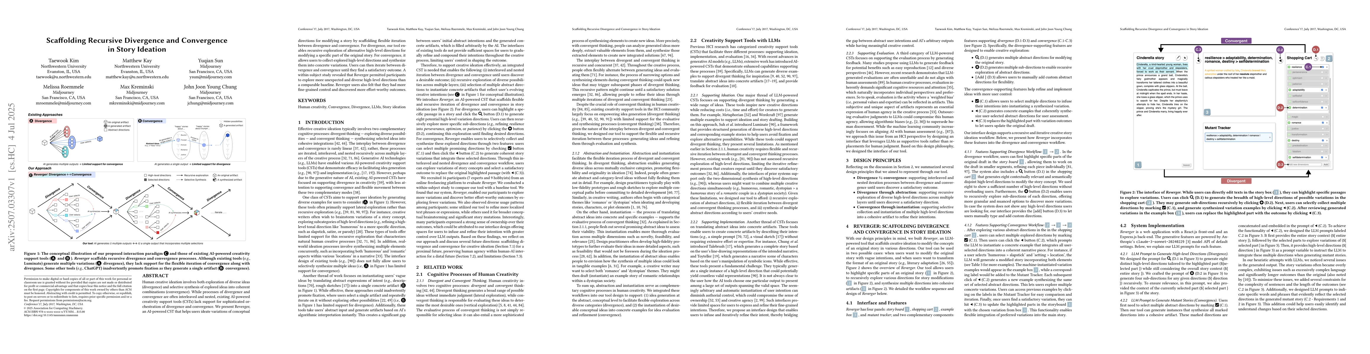 Human creative ideation involves both exploration of diverse ideas (divergence) and selective synthesis of explored ideas into coherent combinations (convergence). While processes of divergence and convergence are often interleaved and nested, existing AI-powered creativity support tools (CSTs) lack support for sophisticated orchestration of divergence and convergence. We present Reverger, an AI-powered CST that helps users ideate variations of conceptual directions for modifying a story by scaffolding flexible iteration between divergence and convergence. For divergence, our tool enables recursive exploration of alternative high-level directions for modifying a specific part of the original story. For convergence, it allows users to collect explored high-level directions and synthesize them into concrete variations. Users can then iterate between divergence and convergence until they find a satisfactory outcome. A within-subject study revealed that Reverger permitted participants to explore more unexpected and diverse high-level directions than a comparable baseline. Reverger users also felt that they had more fine-grained control and discovered more effort-worthy outcomes.