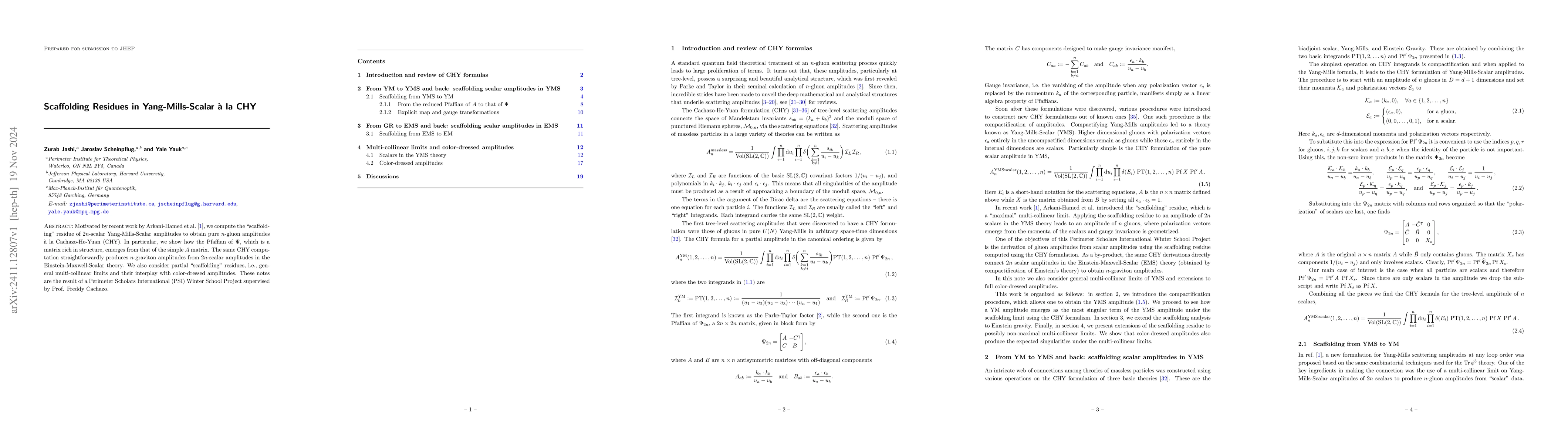 Motivated by recent work by Arkani-Hamed et al. arXiv:2401.00041, we compute the ''scaffolding'' residue of $2n$-scalar Yang-Mills-Scalar amplitudes to obtain pure $n$-gluon amplitudes \`a la Cachazo-He-Yuan (CHY). In particular, we show how the Pfaffian of $\Psi$, which is a matrix rich in structure, emerges from that of the simple $A$ matrix. The same CHY computation straightforwardly produces $n$-graviton amplitudes from $2n$-scalar amplitudes in the Einstein-Maxwell-Scalar theory. We also consider partial ''scaffolding'' residues, i.e., general multi-collinear limits and their interplay with color-dressed amplitudes.