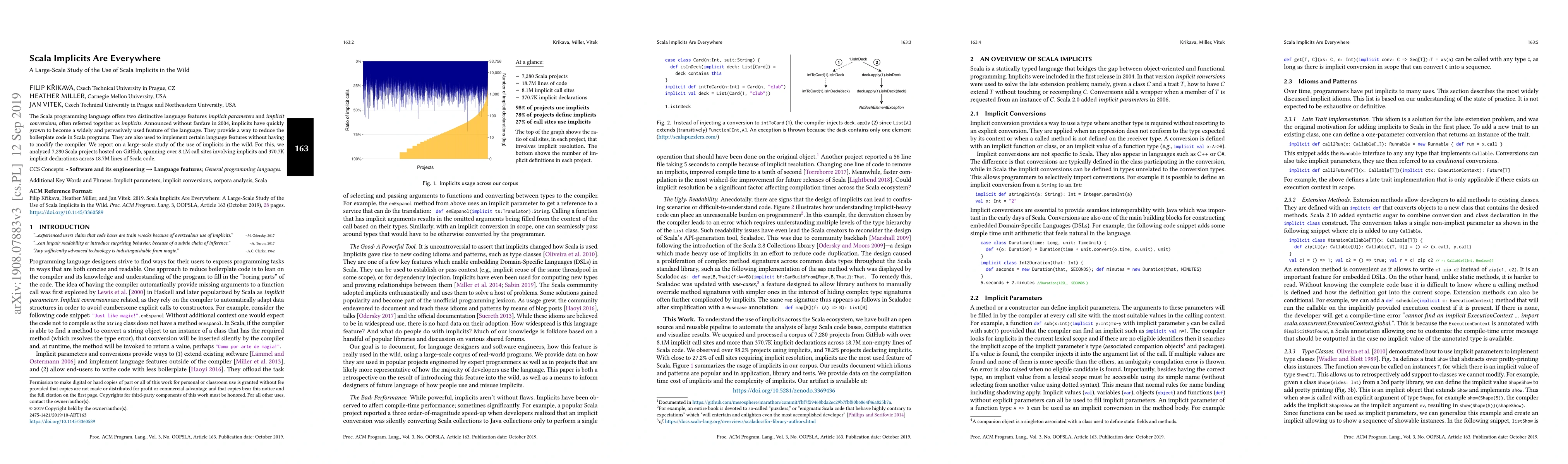 A large-scale study of 7,280 Scala projects found that implicits are widely used to reduce boilerplate code and implement language features, with over 370,000 implicit declarations across 18.7 million lines of code.