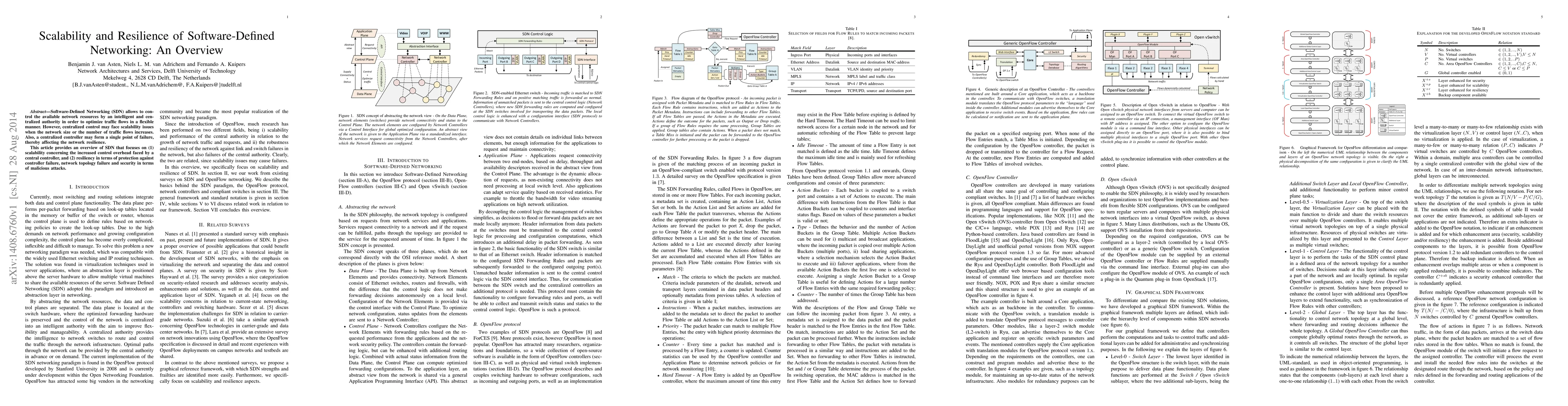 This paper reviews Software-Defined Networking (SDN) focusing on scalability issues due to centralized control overhead and resilience challenges, including protection against controller, topology, and security failures.