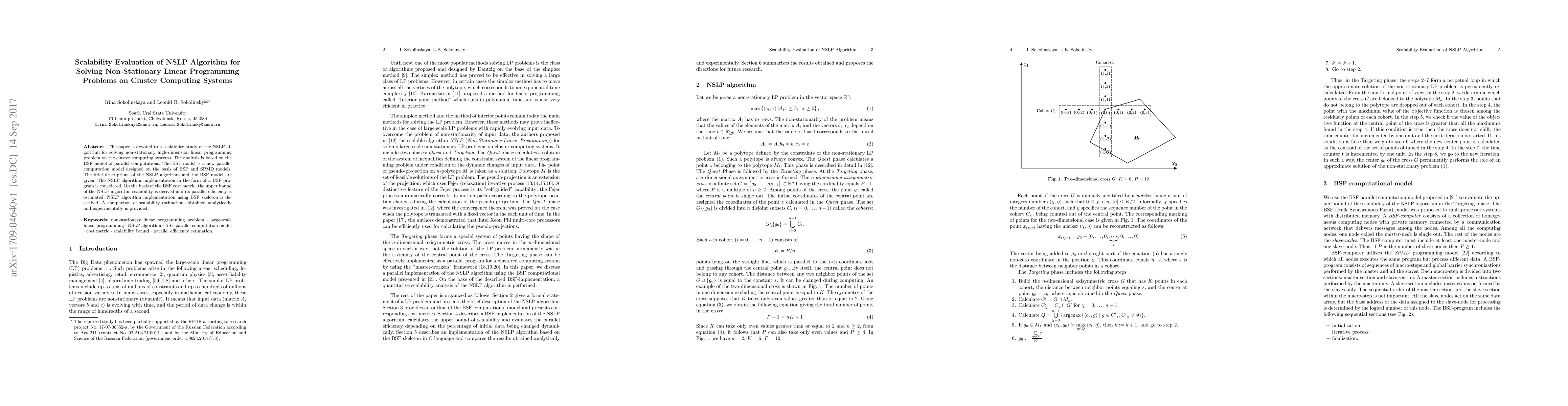The paper is devoted to a scalability study of the NSLP algorithm for solving non-stationary high-dimension linear programming problem on the cluster computing systems. The analysis is based on the BSF model of parallel computations. The BSF model is a new parallel computation model designed on the basis of BSP and SPMD models. The brief descriptions of the NSLP algorithm and the BSF model are given. The NSLP algorithm implementation in the form of a BSF program is considered. On the basis of the BSF cost metric, the upper bound of the NSLP algorithm scalability is derived and its parallel efficiency is estimated. NSLP algorithm implementation using BSF skeleton is described. A comparison of scalability estimations obtained analytically and experimentally is provided.