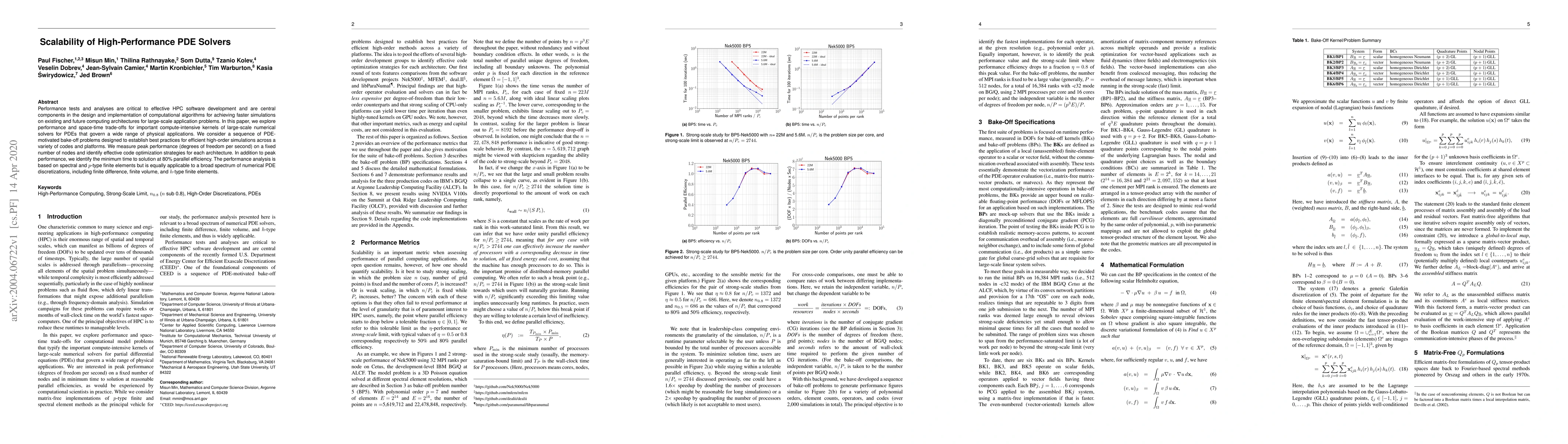 Performance tests and analyses are critical to effective HPC software development and are central components in the design and implementation of computational algorithms for achieving faster simulations on existing and future computing architectures for large-scale application problems. In this paper, we explore performance and space-time trade-offs for important compute-intensive kernels of large-scale numerical solvers for PDEs that govern a wide range of physical applications. We consider a sequence of PDE- motivated bake-off problems designed to establish best practices for efficient high-order simulations across a variety of codes and platforms. We measure peak performance (degrees of freedom per second) on a fixed number of nodes and identify effective code optimization strategies for each architecture. In addition to peak performance, we identify the minimum time to solution at 80% parallel efficiency. The performance analysis is based on spectral and p-type finite elements but is equally applicable to a broad spectrum of numerical PDE discretizations, including finite difference, finite volume, and h-type finite elements.