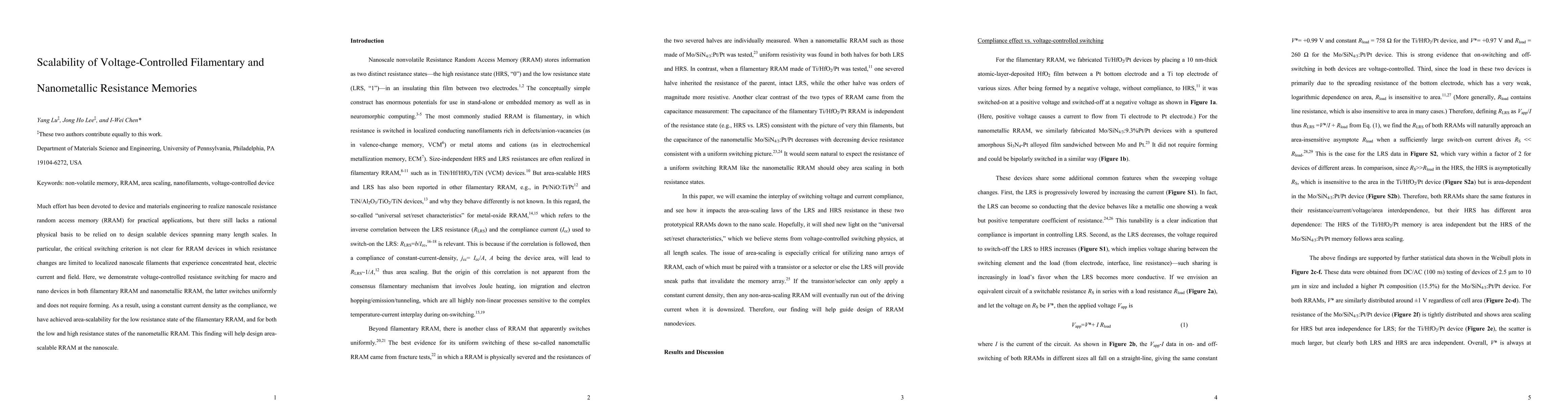 Researchers developed voltage-controlled resistance switching for nanoscale filaments in filamentary and nanometallic RRAMs, achieving area-scalability without forming devices.