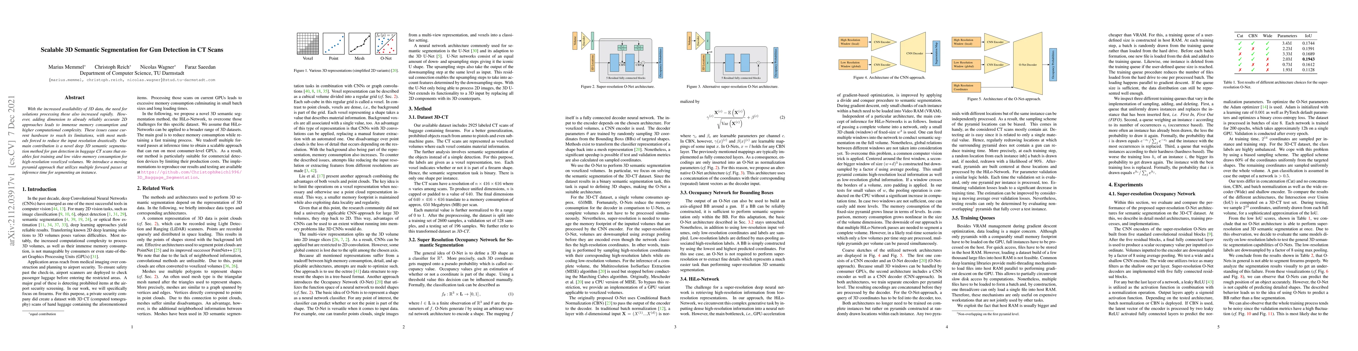 This paper proposes a novel deep 3D semantic segmentation method for detecting guns in CT scans, addressing the challenges of high-resolution data processing with a moving pyramid approach that reduces memory consumption and computational complexity. The method enables efficient training and inference for high-resolution voxelized volumes.