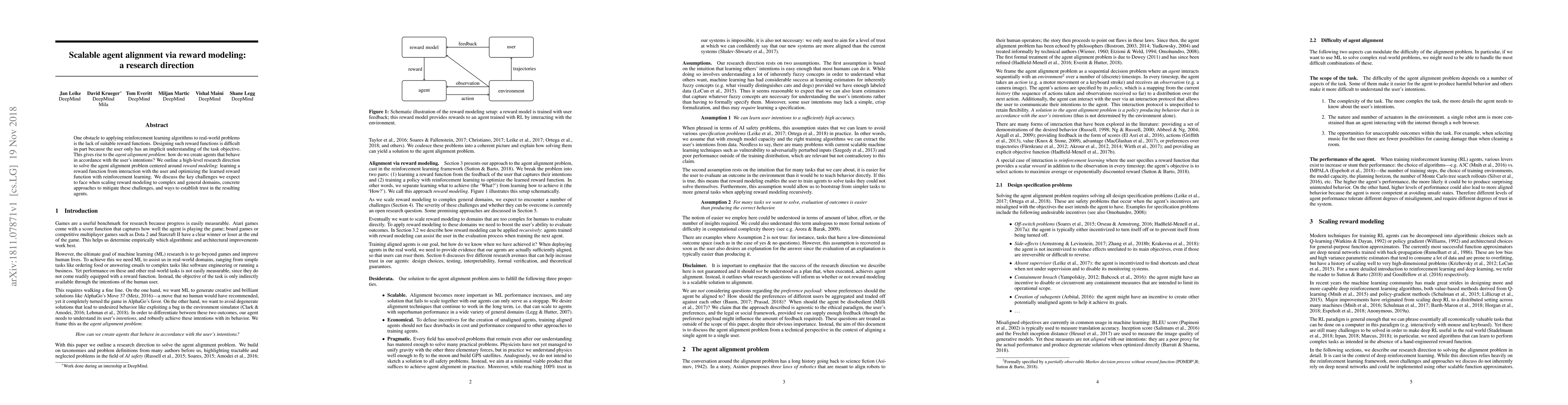 This paper proposes a research direction to tackle the agent alignment problem by developing scalable reward modeling techniques. It focuses on learning reward functions from user interactions and optimizing them via reinforcement learning, while addressing challenges in scaling to complex domains and establishing trust in the resulting agents.